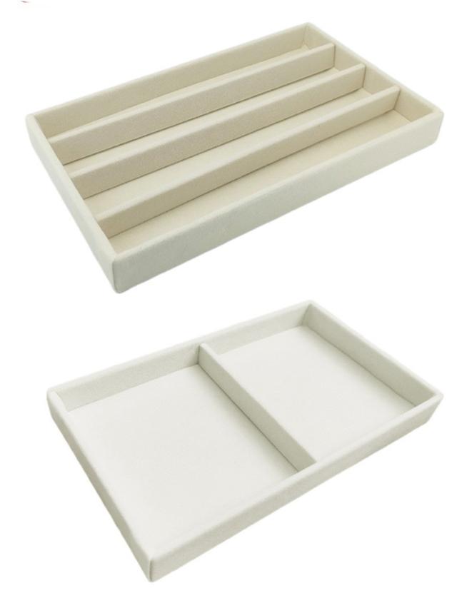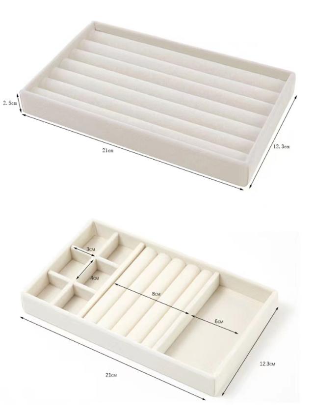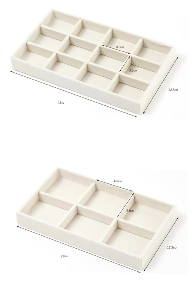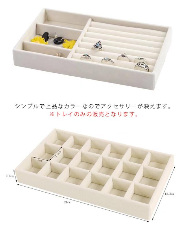 | アクセサリーの収納にピッタリなベロア風トレイです。 様々な仕切りのタイプが揃っているので、ディスプレイ用にも シンプルで上品なカラーなのでアクセサリーが映えます。 ※トレイのみの販売となります。 | |