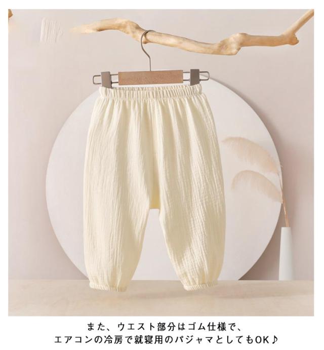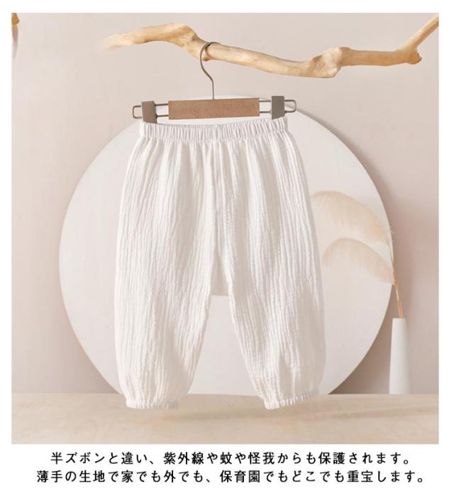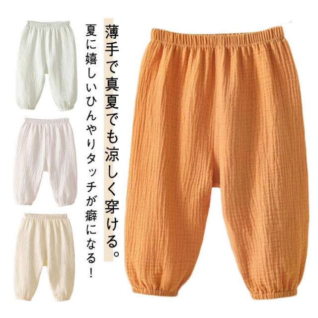 | 薄手で真夏でも涼しく穿ける。夏に嬉しいひんやりタッチが癖になる! ウエストゴムで履き替えやすい、室内でもお出かけの場合も着られるラクチンな長ズボン♪ 真夏でも涼しく履ける通気性の良い涼しい長ズボンです。 半ズボンと違い、紫外線や蚊や怪我からも保護されます。薄手の生地で家でも外でも、保育園でもどこでも重宝します。 また、ウエスト部分はゴム仕様で、エアコンの冷房で就寝用のパジャマとしてもOK♪ | |