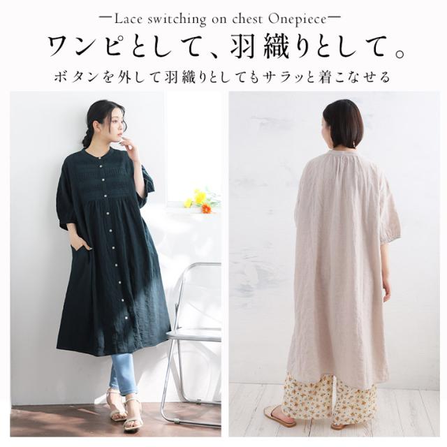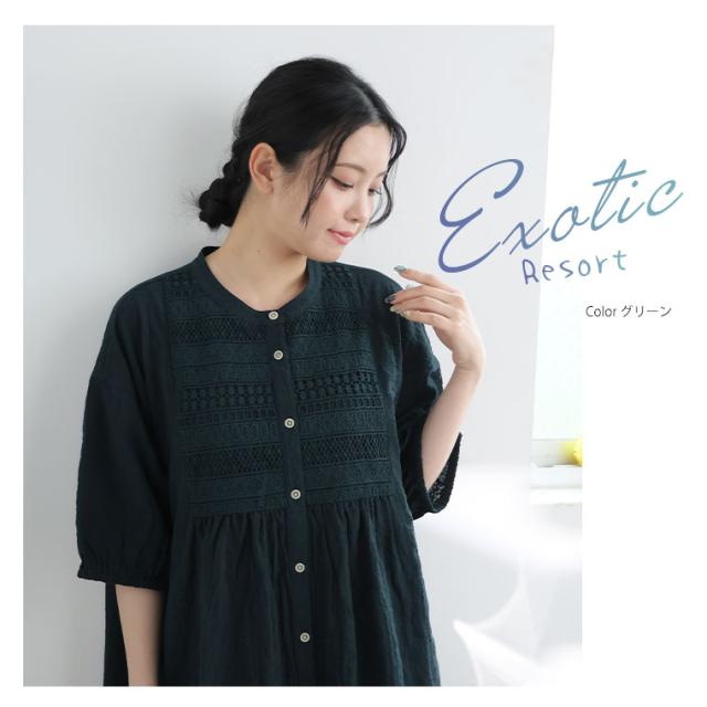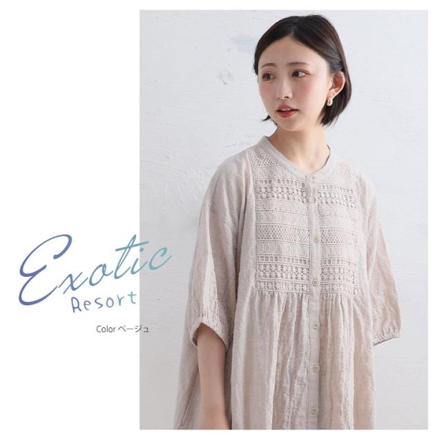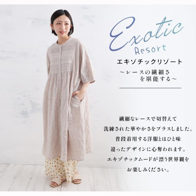 【エキゾチックリゾート】コットン100%のナチュラル素材 胸元レースワンピース