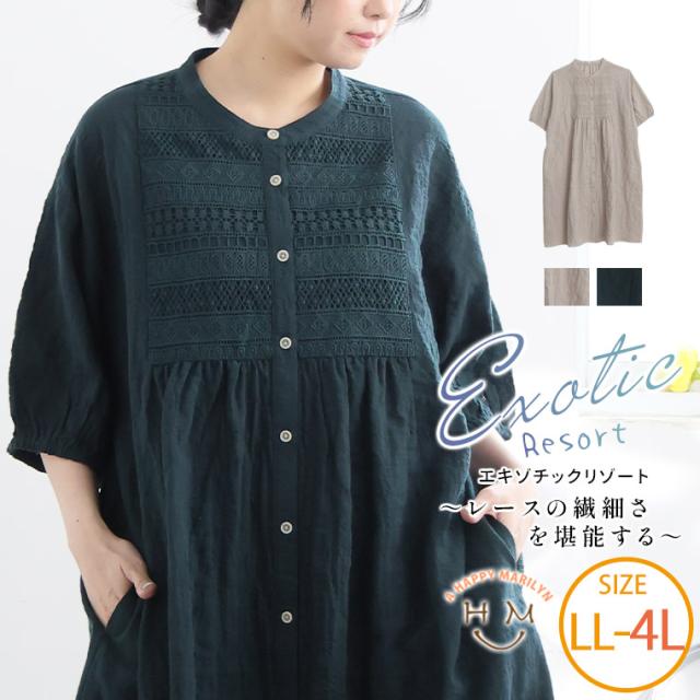 新作 大きいサイズ レディース ワンピース | 【エキゾチックリゾート】 胸元レース切替 五分袖 ワンピース [861755] LL 3L 4L