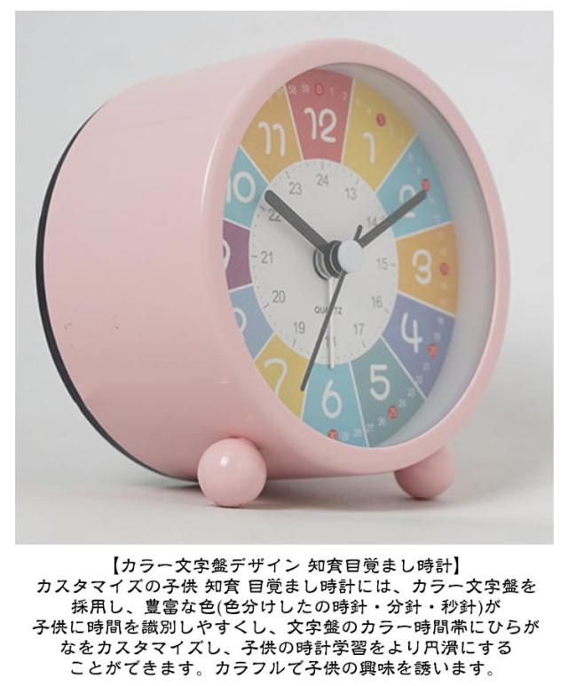 | かわいい虹色の知育目覚まし時計。【5色】 【子供向けの目覚まし時計情報】この目覚まし時計は小学生の男女向けの時計学習用知育目覚まし時計です。高級感あふれる金属塗装面は、マットな質感で指紋汚れなどが付きにくい材質を使用しています。ちょこんと丸い脚と個性的な数字、おしゃれな空洞のある針で、インテリア性も抜群です。 【カラー文字盤デザイン 知育目覚まし時計】カスタマイズの子供 知育 目覚まし時計には、カラー文字盤を採用し、豊富な色(色分けしたの時針・分針・秒針)が子供に時間を識別しやすくし、文字盤のカラー時間帯にひらがなをカスタマイズし、子供の時計学習をより円滑にすることができます。カラフルで子供の興味を誘います。 【静音&連続秒針の置き時計】この目覚まし時計は秒針のカチカチ音がない連続秒針を採用し、時計の計時をより正確にすると同時に、環境に静かさをもたらし、子供の枕元に置いても静かな知育時計です。 【ライト付の夜間見やすい時計】この子供 知育用目覚まし時計は蛍光(時針・分針)とライト機能があります。夜や暗い場所で時間を確認したい時にスイッチ(裏面)で簡単にライトが点灯し、時間の確認も楽にできます。 【時間管理用アラーム機能時計】この学習用アナログ時計はアラーム機能があります。アラーム設定がとても簡単です。子供が定時に起きる、学ぶ或いは遊びのより良い生活習慣を育てることができます。子供の時間管理に便利な学習時計です。 | |