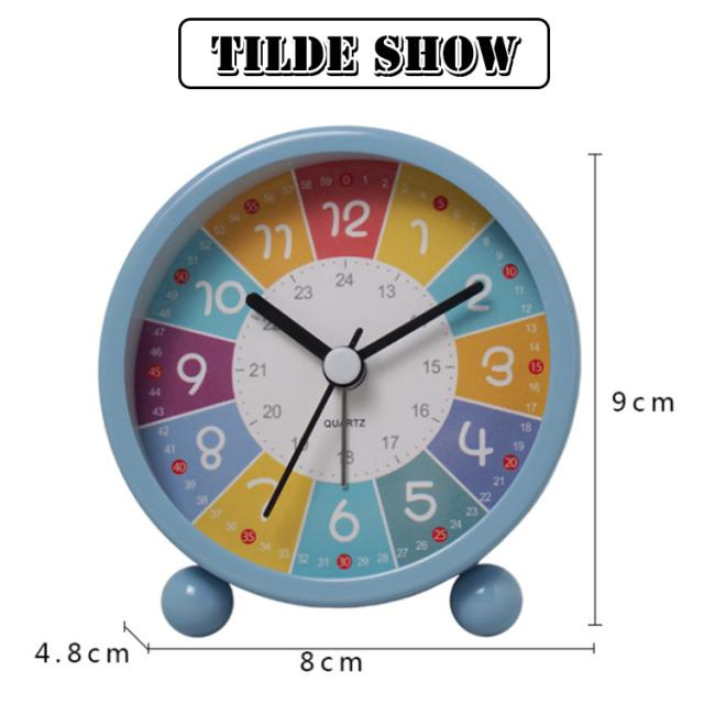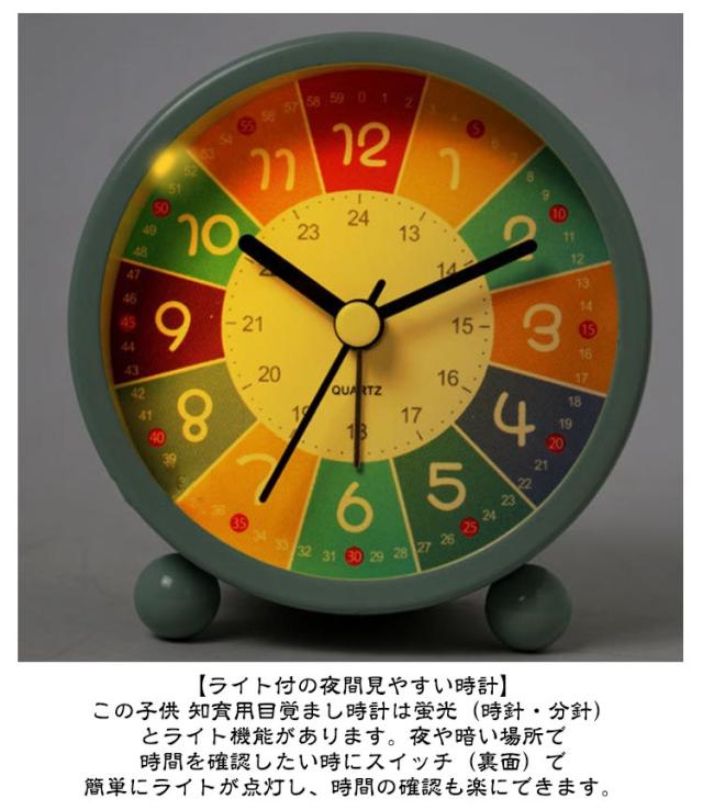 | かわいい虹色の知育目覚まし時計。【5色】 【子供向けの目覚まし時計情報】この目覚まし時計は小学生の男女向けの時計学習用知育目覚まし時計です。高級感あふれる金属塗装面は、マットな質感で指紋汚れなどが付きにくい材質を使用しています。ちょこんと丸い脚と個性的な数字、おしゃれな空洞のある針で、インテリア性も抜群です。 【カラー文字盤デザイン 知育目覚まし時計】カスタマイズの子供 知育 目覚まし時計には、カラー文字盤を採用し、豊富な色(色分けしたの時針・分針・秒針)が子供に時間を識別しやすくし、文字盤のカラー時間帯にひらがなをカスタマイズし、子供の時計学習をより円滑にすることができます。カラフルで子供の興味を誘います。 【静音&連続秒針の置き時計】この目覚まし時計は秒針のカチカチ音がない連続秒針を採用し、時計の計時をより正確にすると同時に、環境に静かさをもたらし、子供の枕元に置いても静かな知育時計です。 【ライト付の夜間見やすい時計】この子供 知育用目覚まし時計は蛍光(時針・分針)とライト機能があります。夜や暗い場所で時間を確認したい時にスイッチ(裏面)で簡単にライトが点灯し、時間の確認も楽にできます。 【時間管理用アラーム機能時計】この学習用アナログ時計はアラーム機能があります。アラーム設定がとても簡単です。子供が定時に起きる、学ぶ或いは遊びのより良い生活習慣を育てることができます。子供の時間管理に便利な学習時計です。 | |