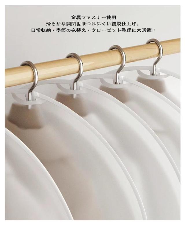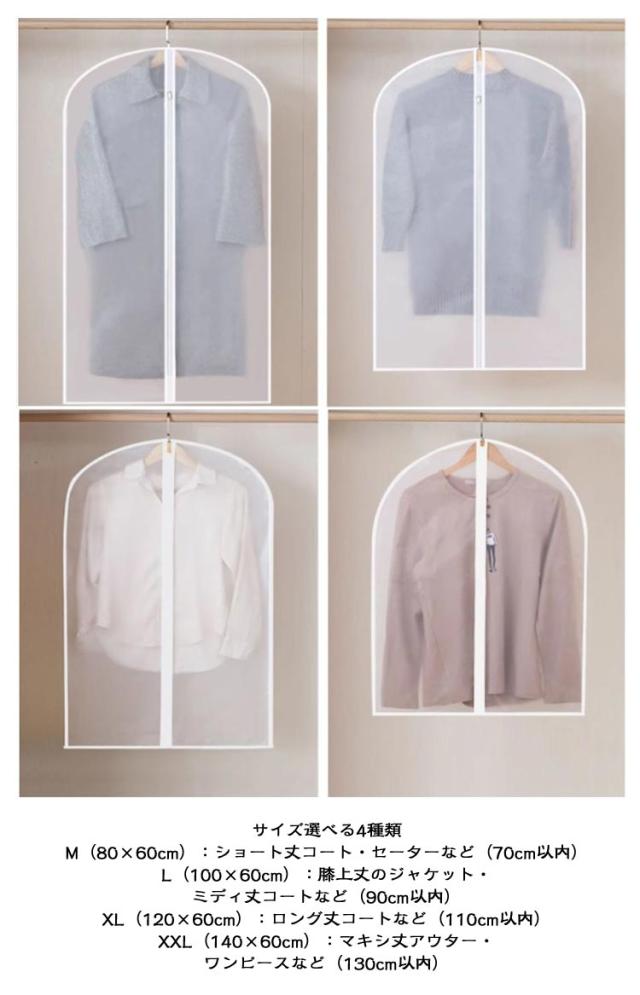 | 【5枚セット】吊り下げ式衣類カバー 防塵・防湿・防水・半透明タイプ 通気性と収納力を両立した防塵カバー ・半透明PEVA素材 中身が見えるから取り出し簡単◎ 防水・防塵・防カビ効果も! ・トップはハンガー穴付き設計 ハンガーを通してすぐ使える。収納も取り出しもスムーズ。 ・洗えて繰り返し使える! 耐久性に優れた素材。表面マット加工で高見え&実用的。 ・金属ファスナー使用 滑らかな開閉&ほつれにくい縫製仕上げ。 日常収納・季節の衣替え・クローゼット整理に大活躍! サイズ選べる4種類 M(80×60cm):ショート丈コート・セーターなど(70cm以内) L(100×60cm):膝上丈のジャケット・ミディ丈コートなど(90cm以内) XL(120×60cm):ロング丈コートなど(110cm以内) XXL(140×60cm):マキシ丈アウター・ワンピースなど(130cm以内) | |