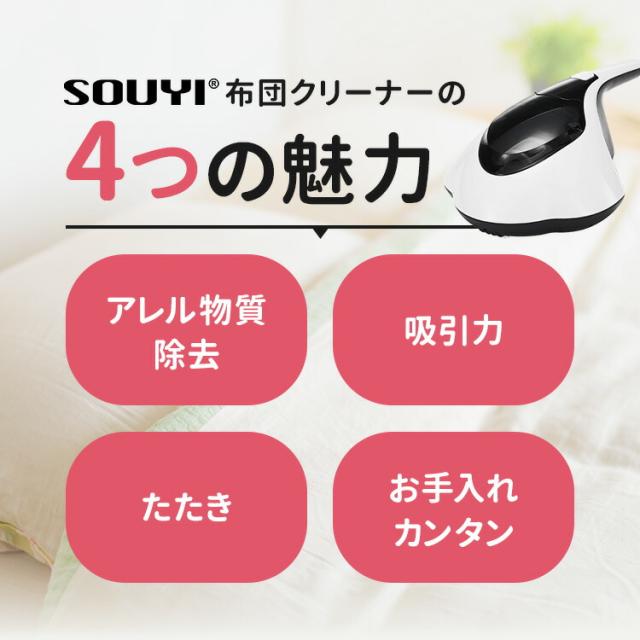 SOUYI 温風布団クリーナー 強力吸引 99.9%徹底除菌UV たたきと50度の温風で布団スッキリ! ![]() ![]() UVランプ 医療現場でも殺菌灯として使用されている、波長253.7nmのUVランプ(紫外線)を、至近 距離からふとんに照射することで、ふとんを除菌します。 ![]() ![]() パワフルたたき 毎分4000回の振動パットで、ハウスダストの飛散を防ぐ水洗いダストボックス、 せっかく取り除いたハウスダスト、お手入れの際に再び空気に飛散らないクリーン構造、ダストボックス ごと水洗いする「水中洗い方式」だから安心です。見えるダストボックスでキレイを実感。 ![]() ![]() ![]() ![]() ![]() ![]() 99.9%集塵するHEPAフィルター 空気清浄機やクリーンルームにも使用される、HEPAフィルターを搭載。 排気をグリーンに保つため、0.3μmの粒子を99.9%集塵する。フィルターに脱臭効果をプラス。ふとん クリーナーならではのこだわりです。布団乾燥機 として使用可能 ※殺菌試験:日本食品分析センター ![]() ![]() ![]() ![]() | ||||||||||||||||||||||||