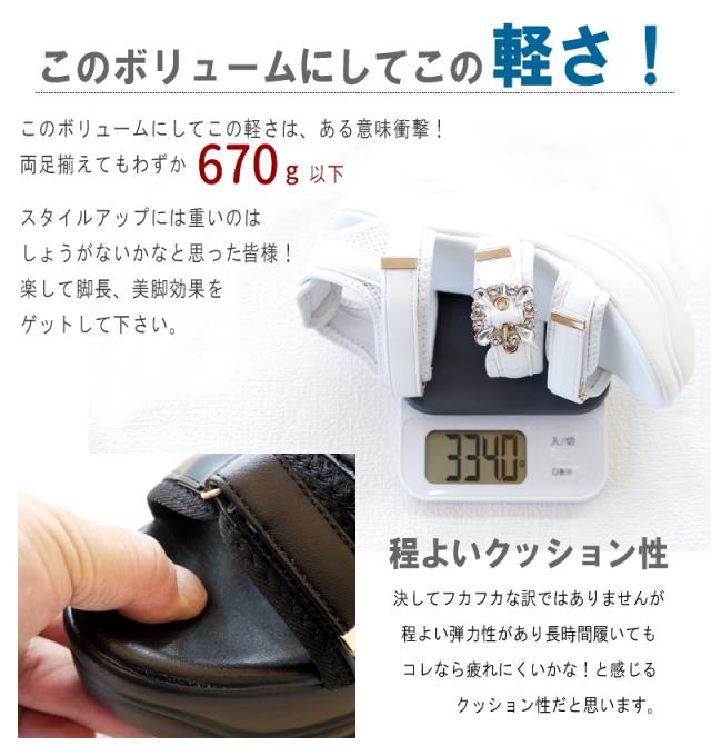 両足揃えてもこのボリュームでたったの約670g!一日快適スタイルアップが叶う、厚底スポサン。