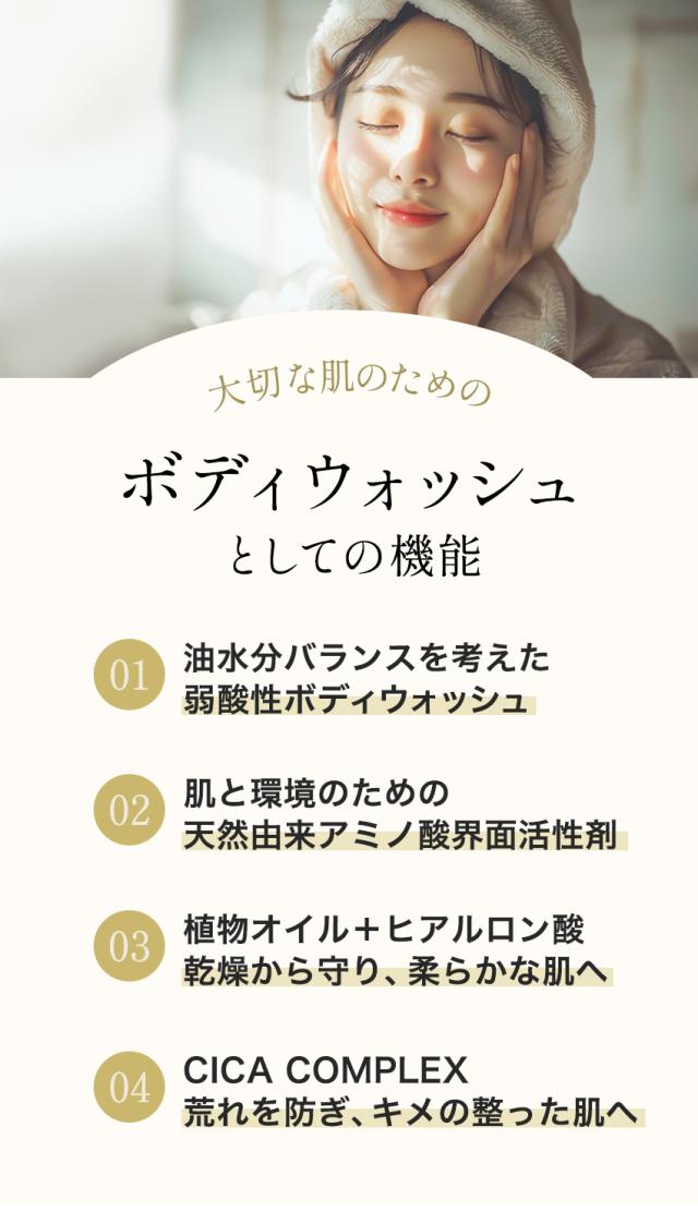適量を手やボディタオルにとり、泡立ててから身体を洗い、ぬるま湯で洗い流します。
