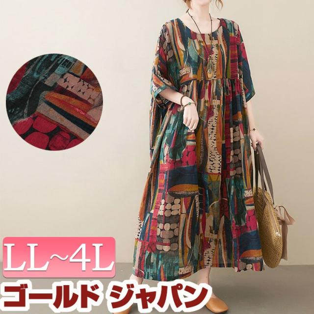 春新作 大きいサイズ レディース ワンピース マルチカラーコットンワンピース ワンピ ロングワンピース ロング マキシ ラウンドネック 五分袖 Aライン エスニック柄 鮮やか ギャザー リラクシー ルーム ゆったり 春服 秋服 F フリー LL 2L 3L 4L マルチ ゴールドジャパン