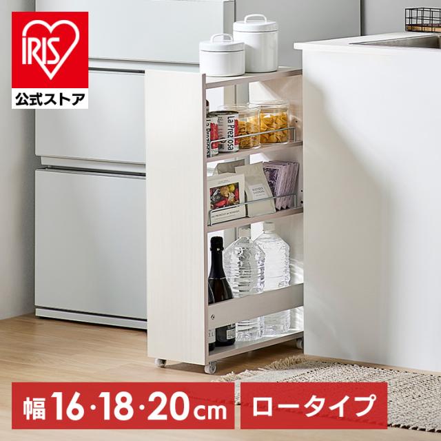 (検索用:隙間収納・16cm・18cm・20cm・キッチンラック・スリム・キャスター付き・ストッカー・収納・おしゃれ・パントリー・棚・薄型・冷蔵庫横・洗面所・ランドリー・ワゴン・すきま収納・キッチン収納・ロータイプ・4967576780216・4967576780223・4967576780230・アイリスオーヤマ)