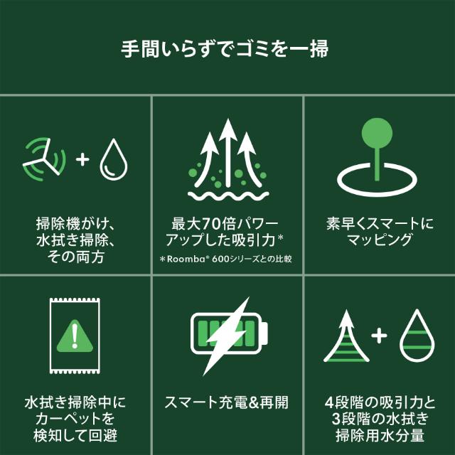最大70倍※にパワーアップした吸引力と、賢くなったナビゲーションで部屋の隅々までしっかり掃除機掛け、水拭きを行います。【コスパとシンプル機能を求めるあなたに】