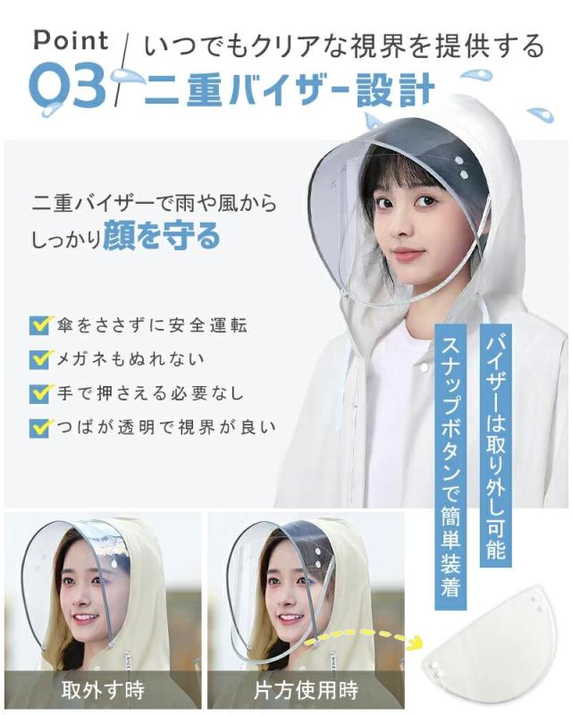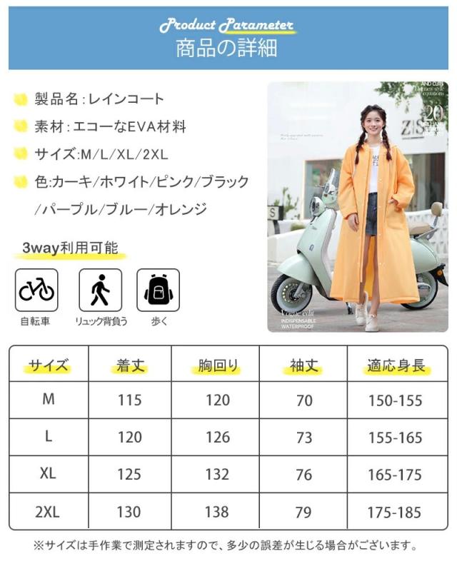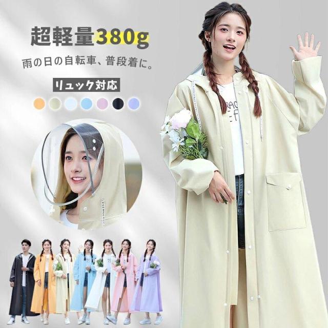 【お勧めポイント】:【高品質のEVA素材】急な悪天候の時にもすぐにご利用いただけるファスナー&シール式のを採用しています。安心で便利に、着脱ぎしやすいアイテム。市場のレインコートと違って、弊店のレインコートは高品質のEVA素材を使用し、長年ご利用いただけます。自転車 原付におすすめ!リュックを背負ったまま着れる!ロング丈オーバーサイズ登場!【二重レインバイザー付き】取り外し可能な透明バイザー付属、フードにつければ、飛沫防止、風・雨・雪よけしながら、クリアな視界を確保可能。斜めから雨が来ても顔が濡れにくいし、風が強い日でもフードが吹き飛ばされません。フードはロープ付き、サイズを調節して雨水の浸入を防ぐことができます。これさえあれば傘をささなくても、自転車やバイク運転の時も、視界をこもらずに安全運転ができて大変便利です。【強力撥水&防水加工&耐摩力が抜群】耐水圧8,000、台風にも対応可能。レインコートは前開き仕様で防水ファスナー+ボタン2重防水構造,傷がつきにくく、目に見える厚みがあり、ゴム臭がありません。防水性が高く丈夫で破れにく耐久性にも優れたレインコートです。大雨でも心配することなく、旅行やアウトドア、レジャーに安心使用できます。レインコート収納袋付きで、軽量材質のため、リュックサックや通勤用カバンに入れても持ち運び便利、 コンパクトに折りたたんで自宅/事務室/車の中に常備すれば、急な雨にも対応できます。強風時は破損する恐れがあるので使用時ご注意ください。 ご使用後は必ず陰干しにしてからおしまいくだい。【環境に優し超軽量の新型防水素材&性能が高い】環境に優しい新型防水素材作られのレインコート、 無味無臭で、着心地が良い!通気性が抜群ので、真夏でも安心使用。 厚手ながら丈夫で、柔らかくて破れにい、防水性もバッチリ。 それに高抗汚れなので、大雨でも心配もいらない。
