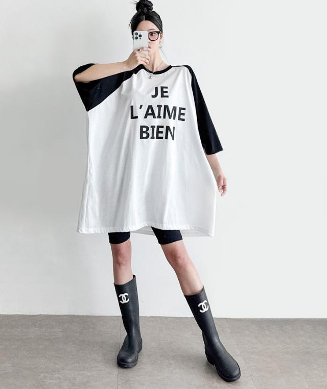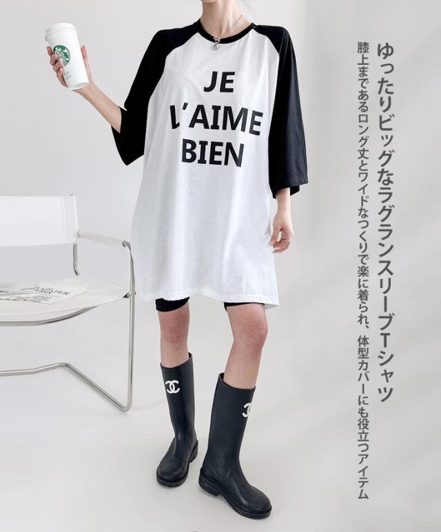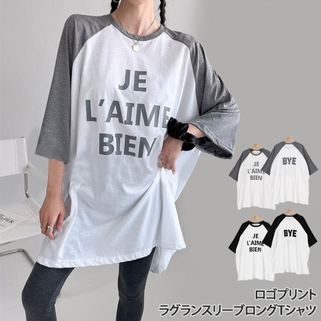 新作 前後ロゴプリントラグランスリーブロングTシャツ レディース トップス 春 夏 7分袖 長袖 薄手 綿 コットン ゆったり 大きいサイズ 大きめ ストレッチ カジュアル かっこいい ラフ 体型カバー ロゴT
