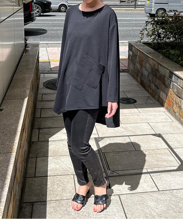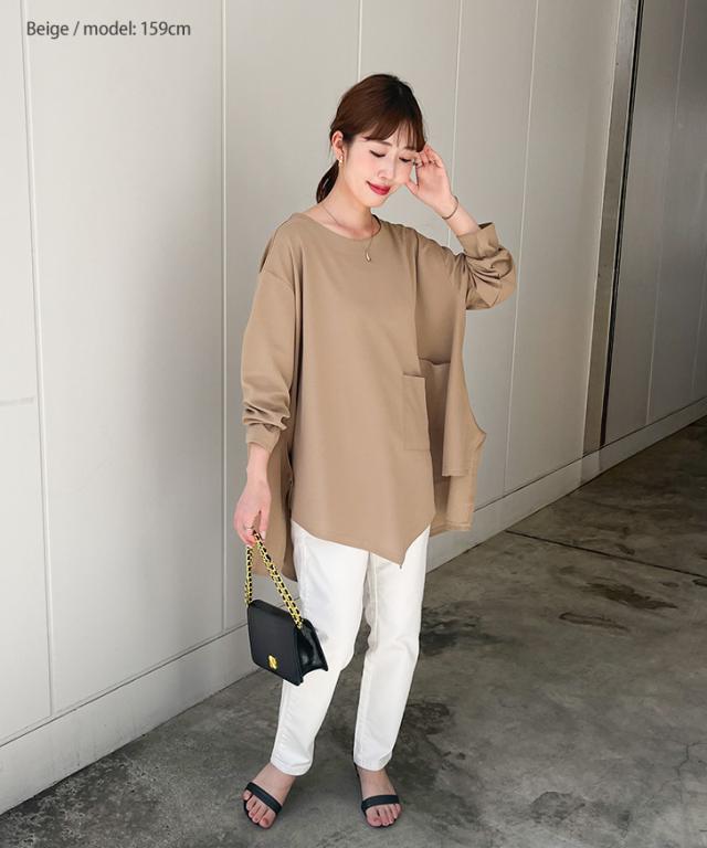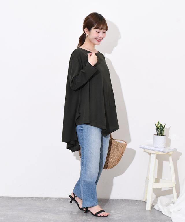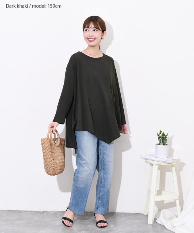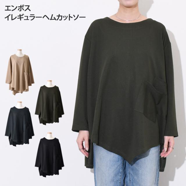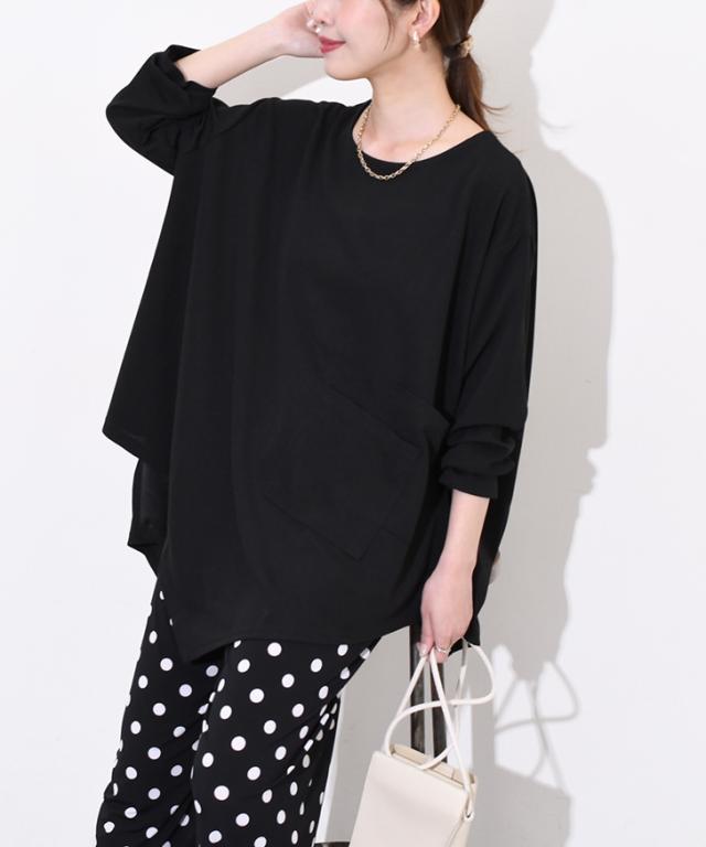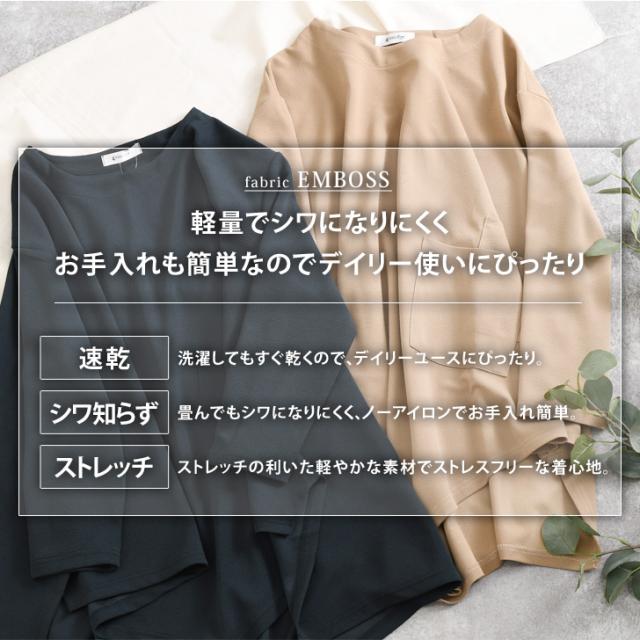 新作 ビッグシルエットダブルポケットエンボスイレギュラーヘムカットソー レディース トップス カジュアル おしゃれ Tシャツ 春 夏 速乾 長袖 大きいサイズ ゆったり 体型カバー イージーケア シワになりにくい