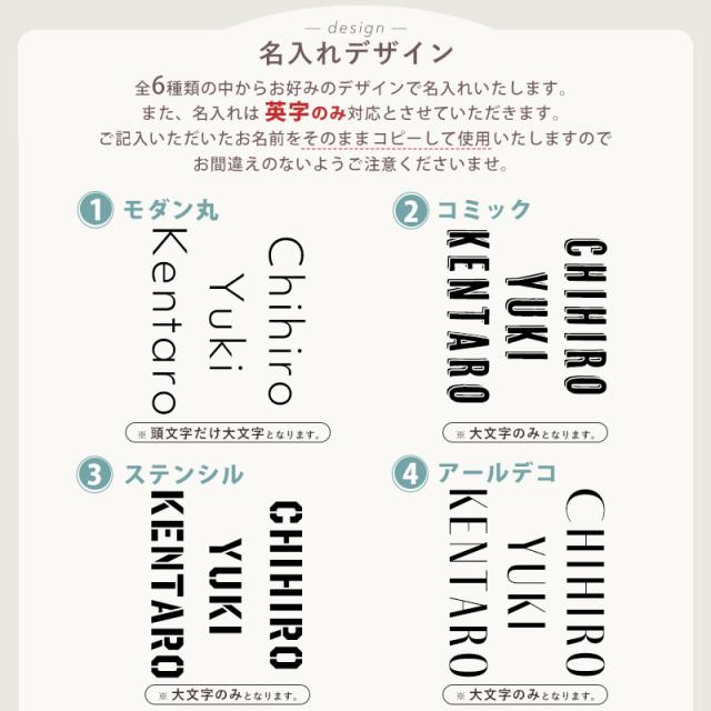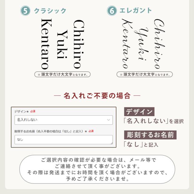 ・彫刻するお名前は「かごに追加」の前に「彫刻するお名前」欄へご記入下さい。 ・名入れは英字のみの対応とさせていただきます。 ・名入れデザイン「1」「5」「6」・・・頭文字だけ大文字となります。 ・名入れデザイン「2」「3」「4」・・・全て大文字のみとなります。 ・デザインまたはお名前の文字数によって彫刻サイズが異なります。レイアウトは当店熟練の職人にお任せとなります。 ・ご記入いただいたお名前をそのままコピーして使用いたします。必ずお間違えの無いようご注意ください。 ・ご注文後、名入れ作業に取り掛かっている場合は変更、キャンセルは承れませんので、変更、キャンセルの場合は早急にご連絡ください。 ・彫刻するお名前についてお問い合わせをさせていただいた場合、お返事をいただいてからの作業となります。 |