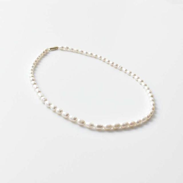 rapiecage(ラピエサージュ)より淡水パール 1連 ネックレスのご紹介です。やわらかくなめらかな輝きを放つ淡水真珠を使用し、ベーシックで飽きのこないデザイン。クラシカルを新しくするオーバル型のパールで、カジュアルにも使いやすいデザインです。デニムとカットソーやシンプルなニットなど、定番のスタイルをクラスアップ。ミニマルなデザインで結婚式やお子様の入学式などフォーマルシーンでもご利用いただけます。 やわらかくなめらかな輝きを放つ淡水真珠を使用しています。クラシカルを新しくするオーバル型のパールタイプを使用。 カジュアルにも使いやすいデザインです。デニムとカットソーやシンプルなニットなど、定番のスタイルをクラスアップ。ミニマルなデザインで結婚式やお子様の入学式などフォーマルシーンでもご利用いただけます。 エンドにはシンプルな差し込み式のメタルパーツで、付け外しもしやすく雰囲気を邪魔しません。 ロゴ入りのオリジナル巾着が付属するので使用しない間も優雅に保管ができます。 シリーズ展開の淡水パールアクセサリーもぜひご確認ください。