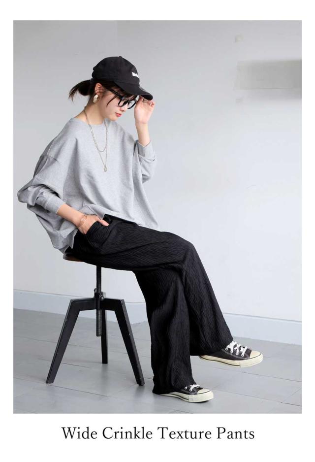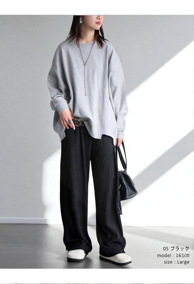 まっすぐ落ちるストレートなワイドシルエットは、脚のラインを拾わず、自然に体型カバーしてくれる優れものです。