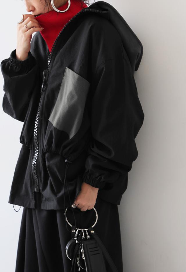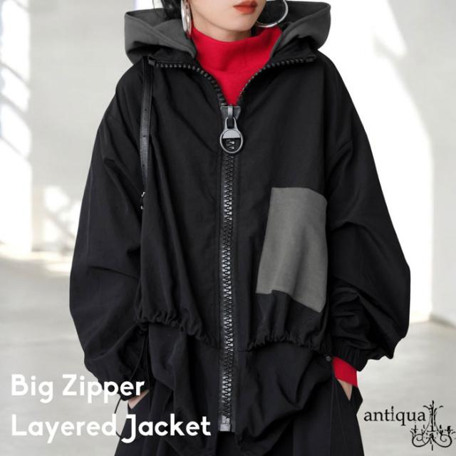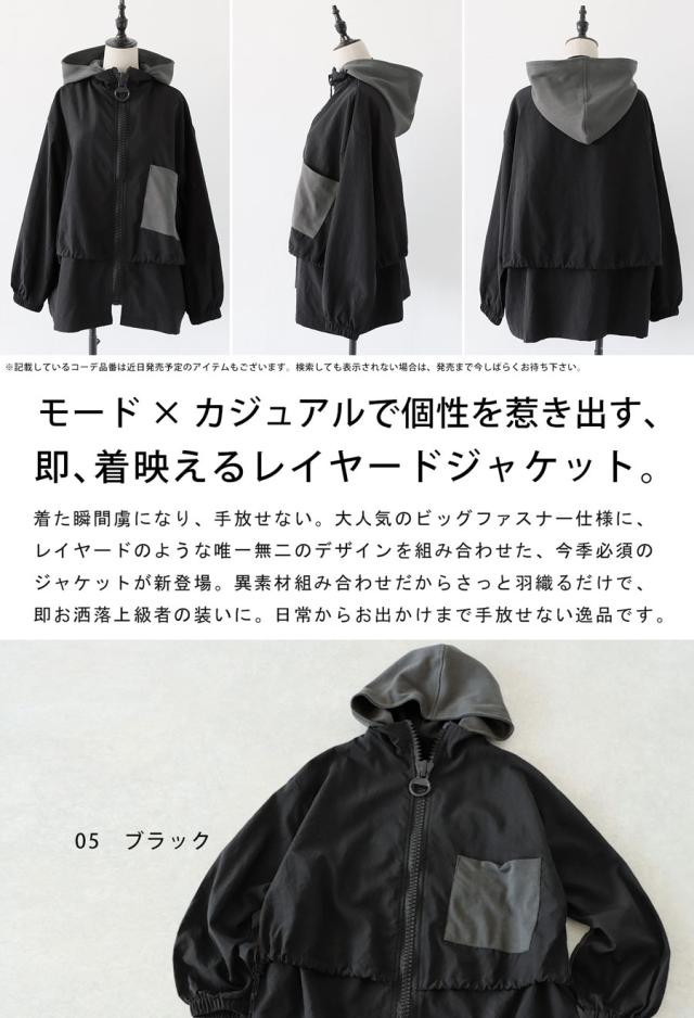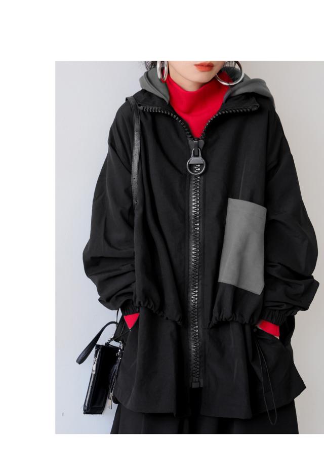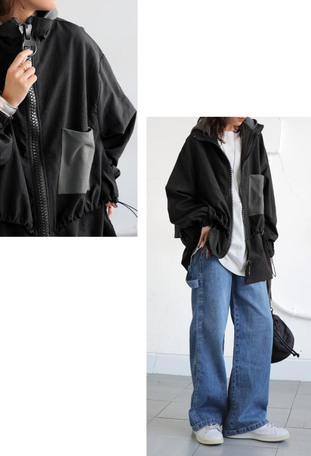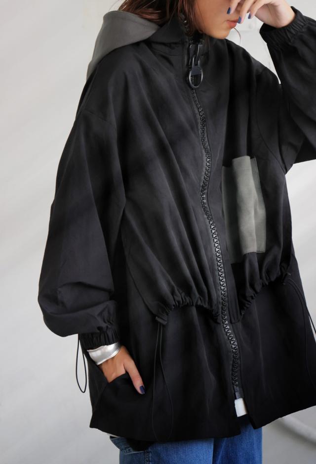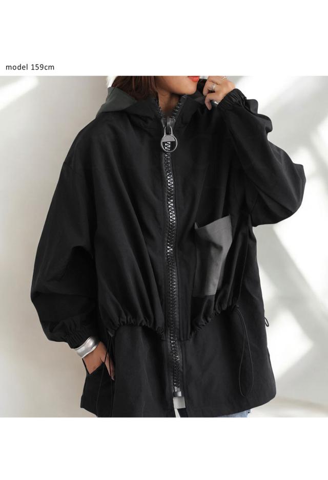 ze-01132 ジャケット ビッグファスナー ジップアップ フード付き ドロスト仕様 異素材 切替 立体シルエット 体型カバー モード カジュアル ユニセックス ビッグジップ
