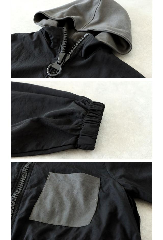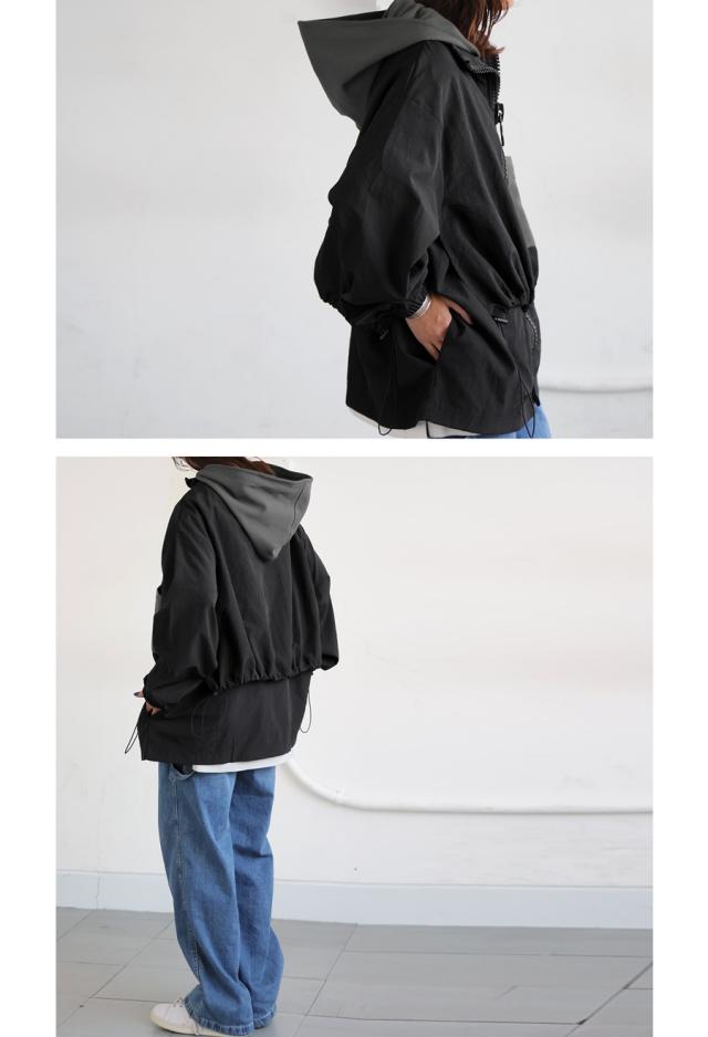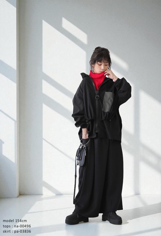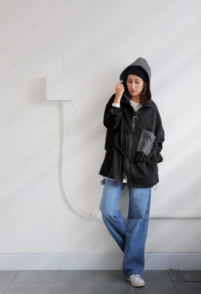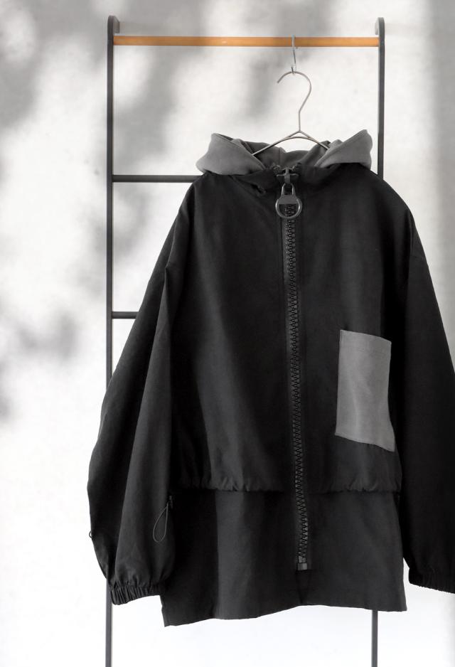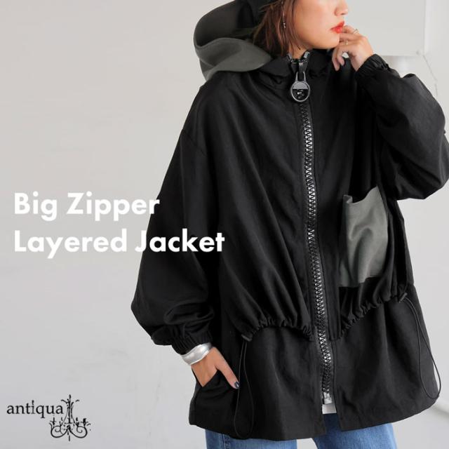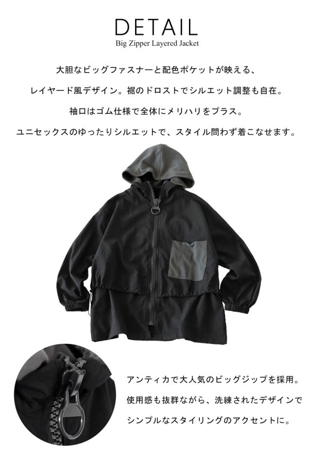 ze-01132 ジャケット ビッグファスナー ジップアップ フード付き ドロスト仕様 異素材 切替 立体シルエット 体型カバー モード カジュアル ユニセックス ビッグジップ