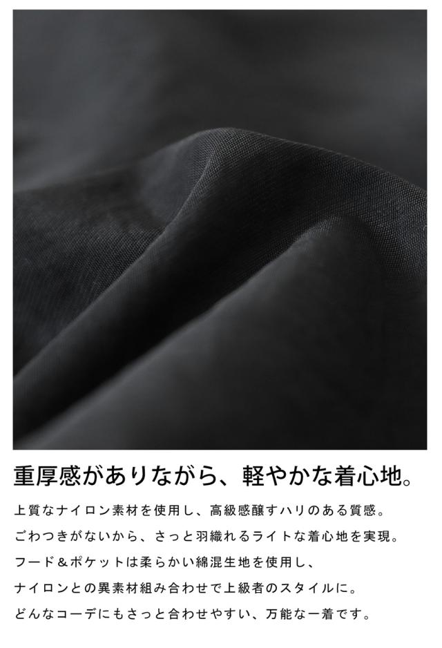 重厚感がありながら軽やかな着心地のナイロン混素材を採用し、季節の変わり目にも最適です。