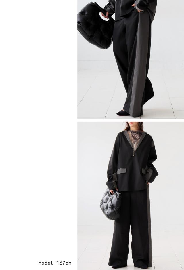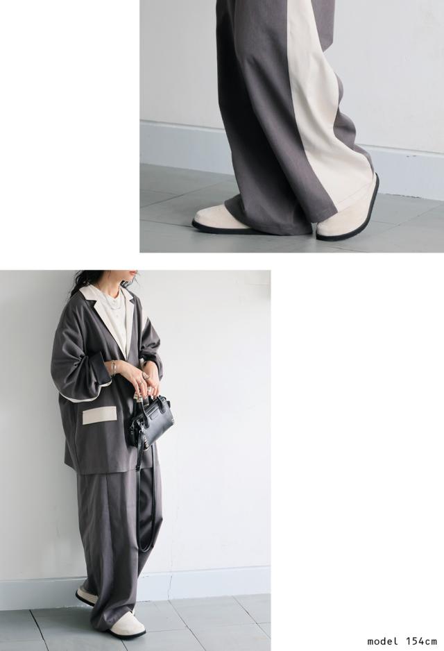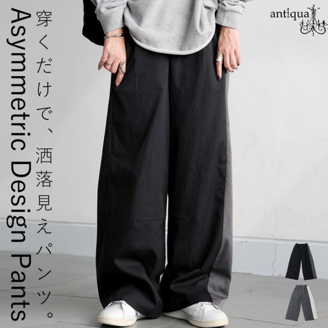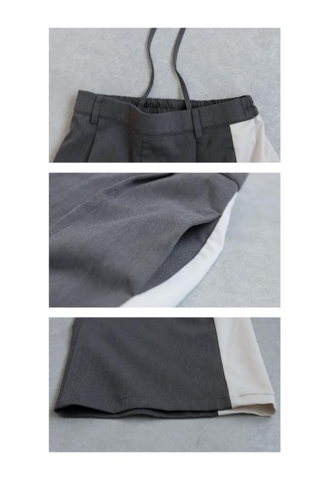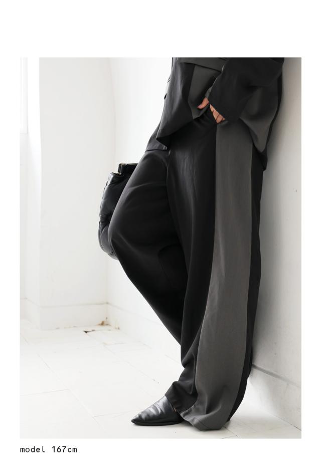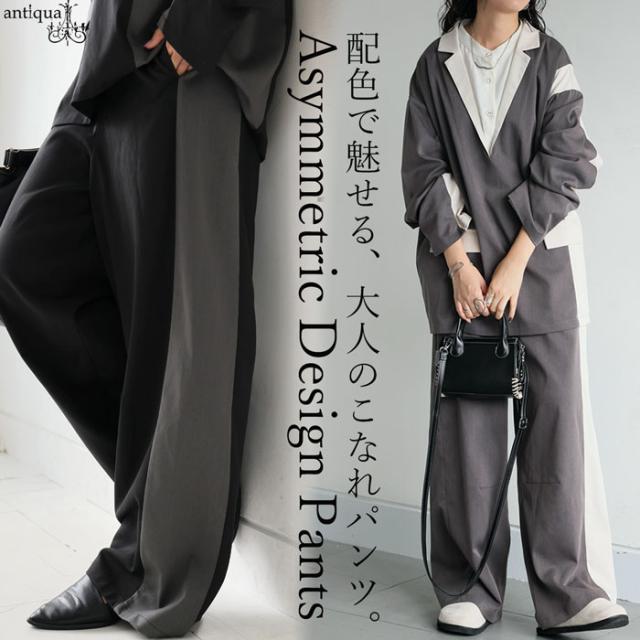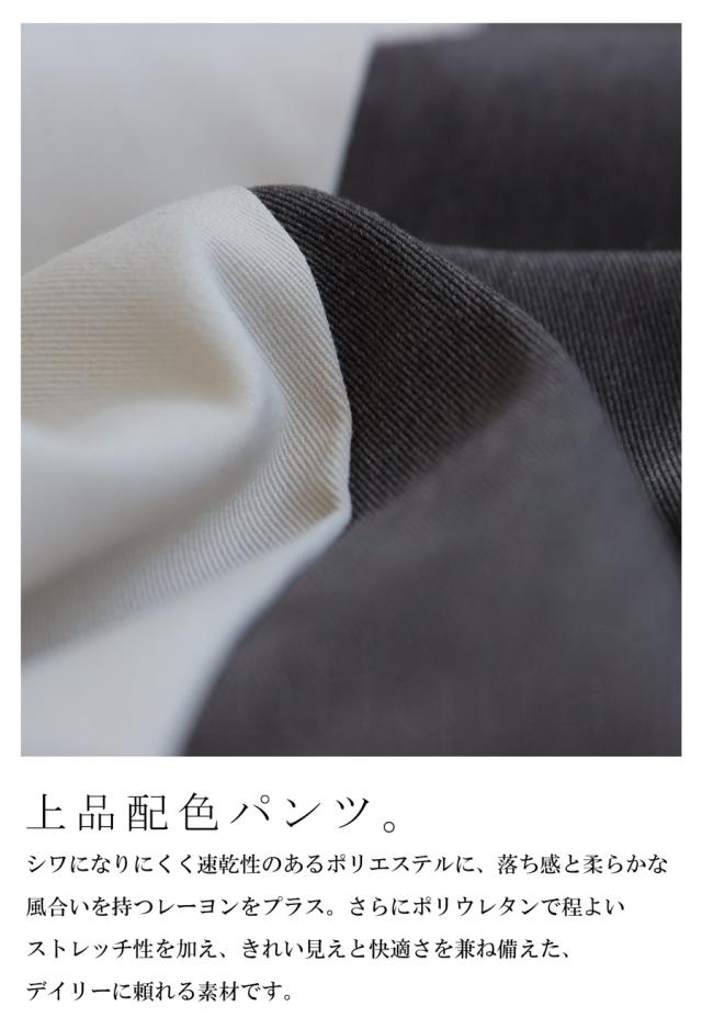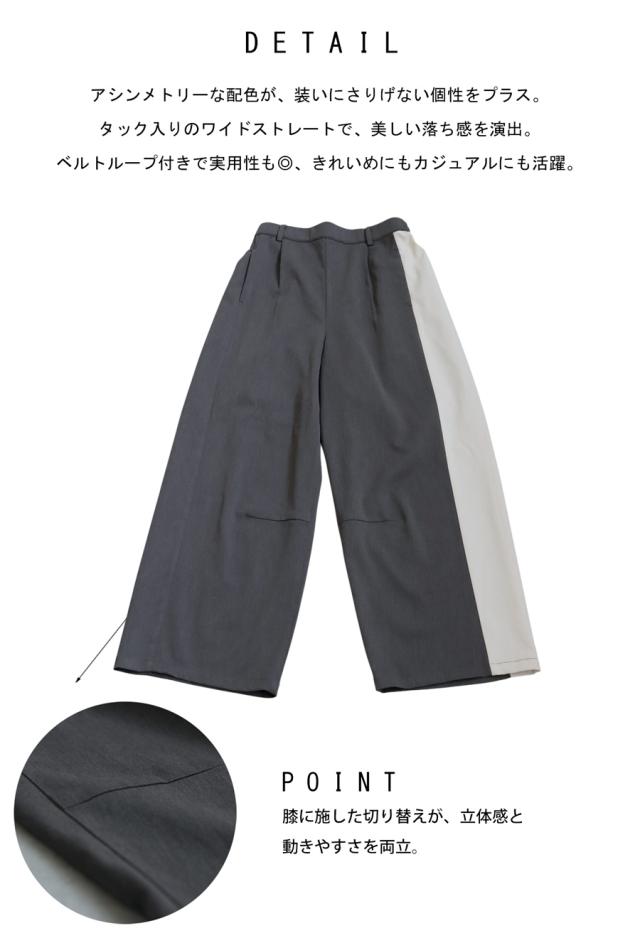 左右で表情が異なるアシンメトリーな配色が魅力の配色パンツ。