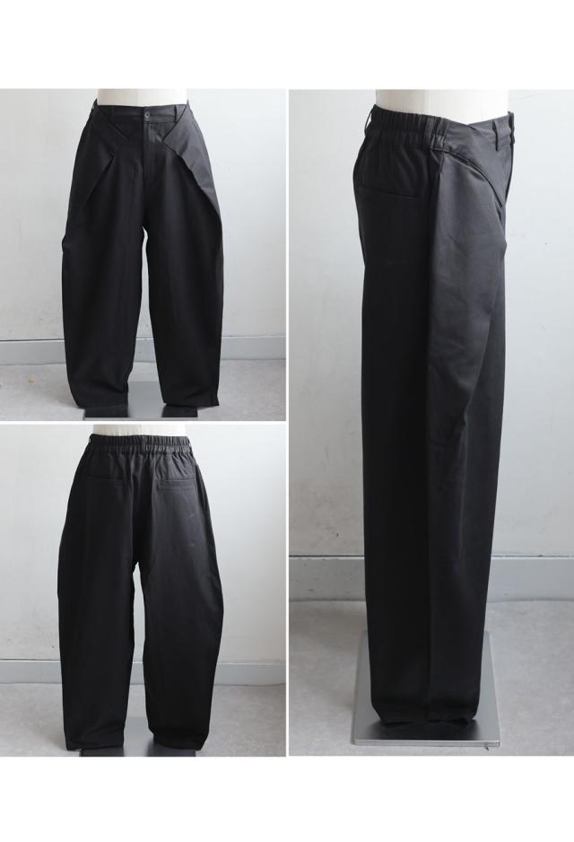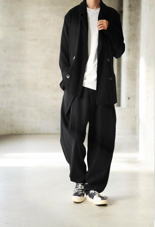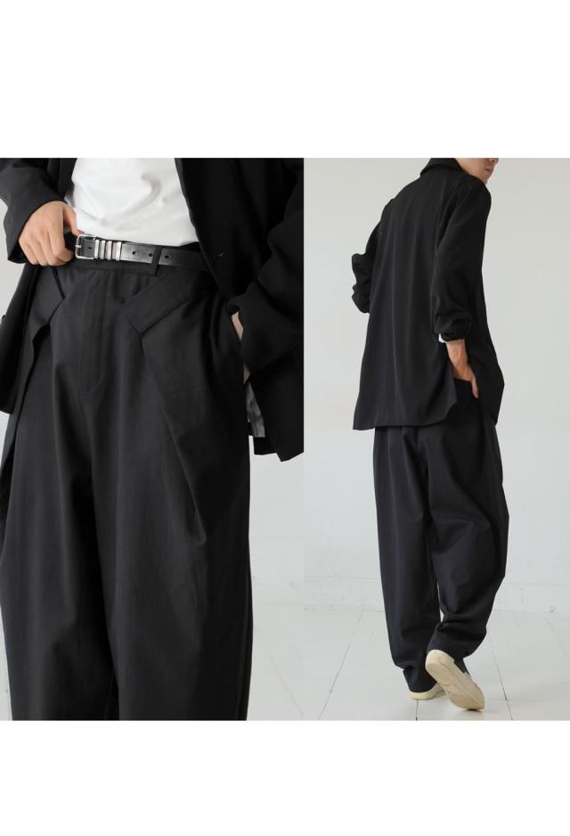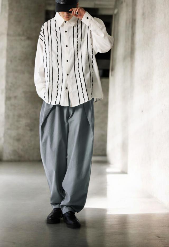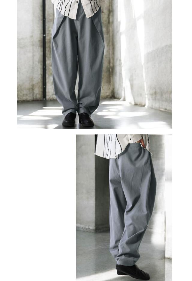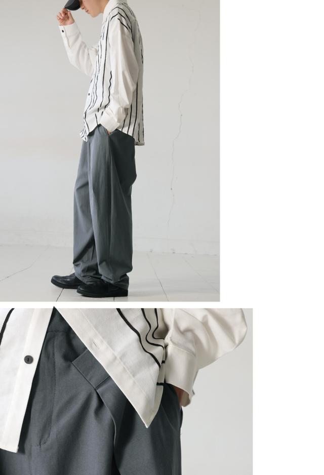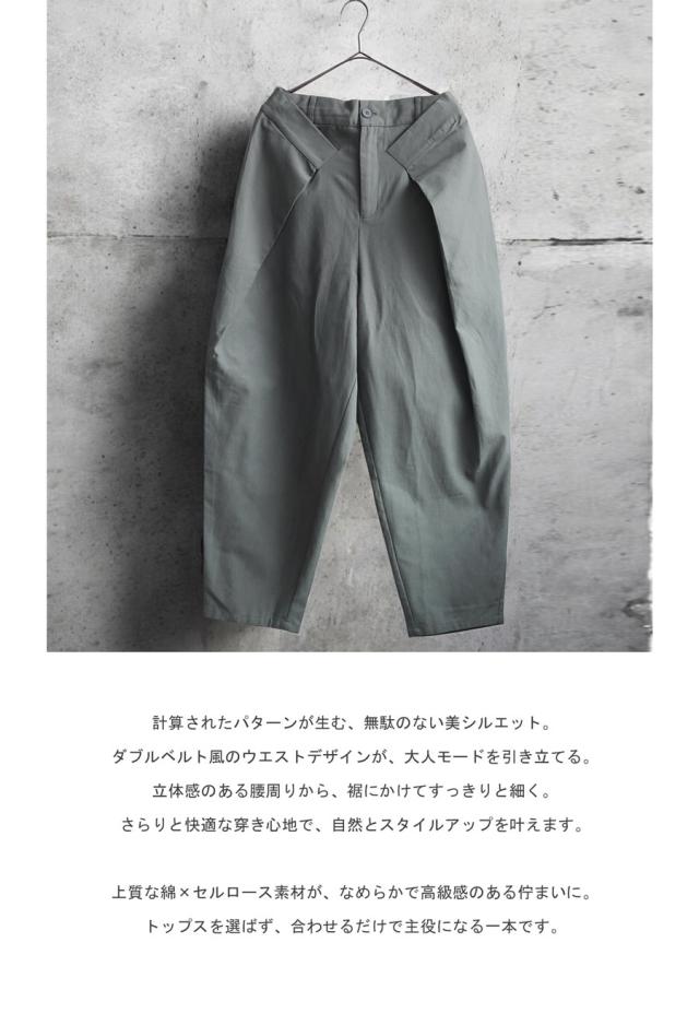 ウエスト部分にはダブルベルト風の切り替えを採用し、ミニマルながらも個性を感じさせるモードなアクセントをプラス。