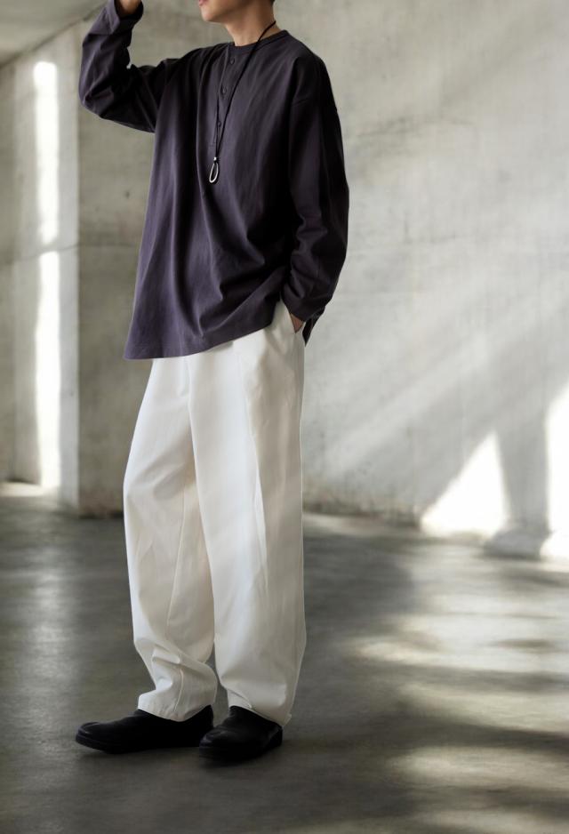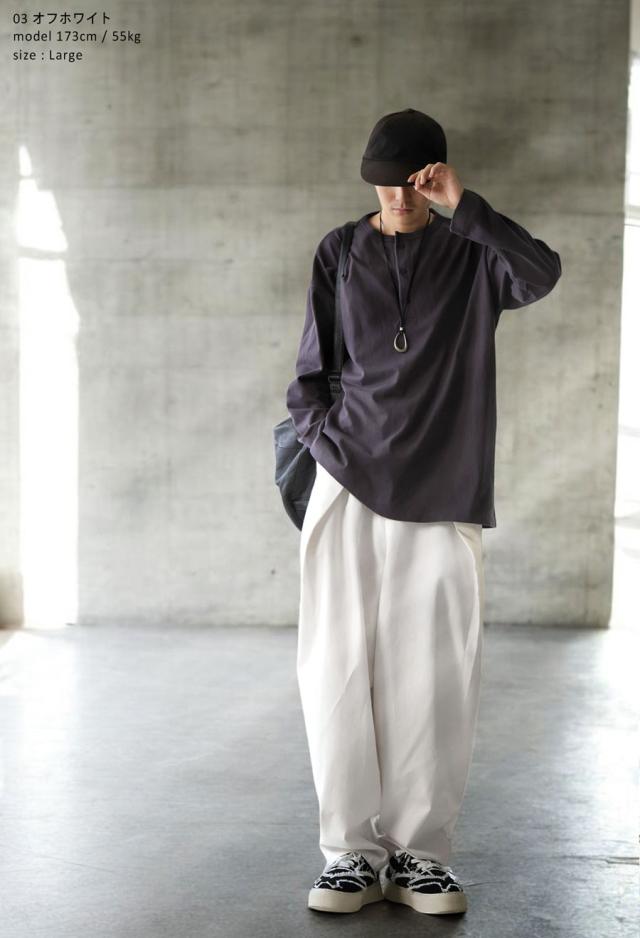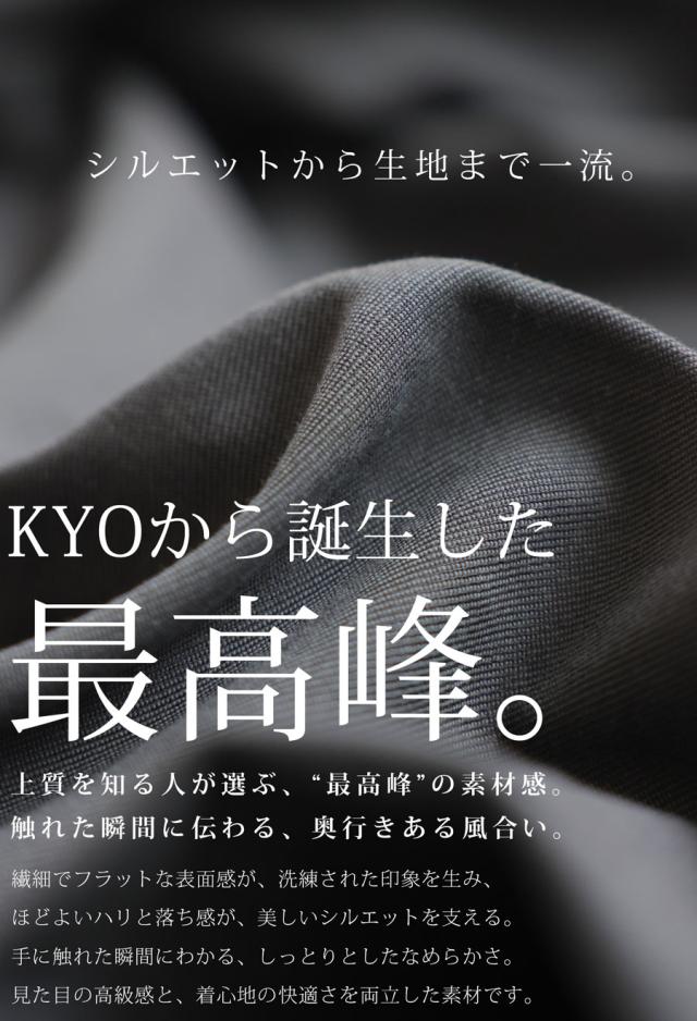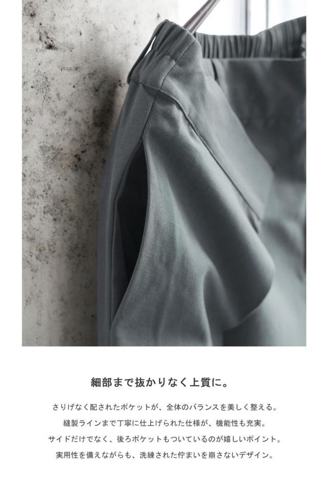 生地は綿×セルロース混素材を使用し、手に取った瞬間に感じるしっとりとしたタッチと、適度なハリが魅力。動きやすさと品のある風合いを兼ね備えた仕上がりです。
