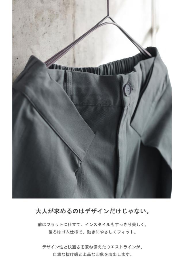 フロントはフラット仕様でトップスをインしやすく、後ろウエストはゴム入りで着用感にも配慮。