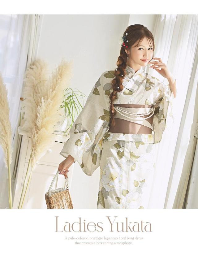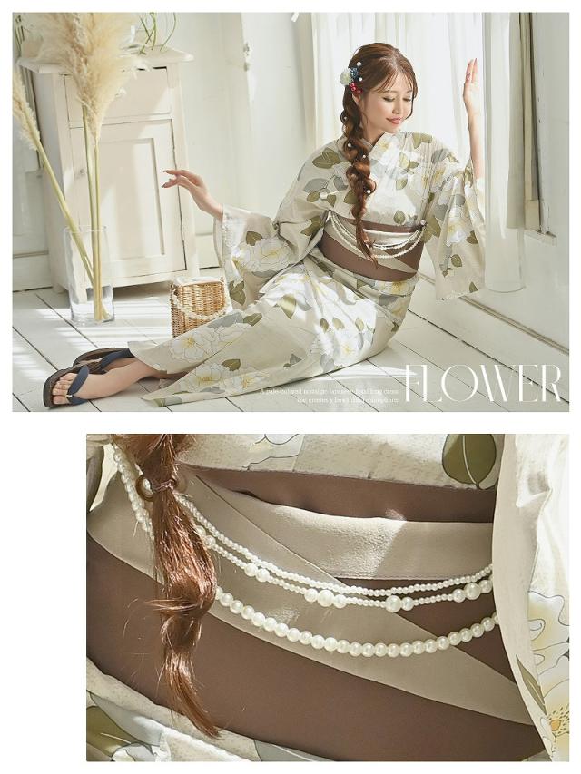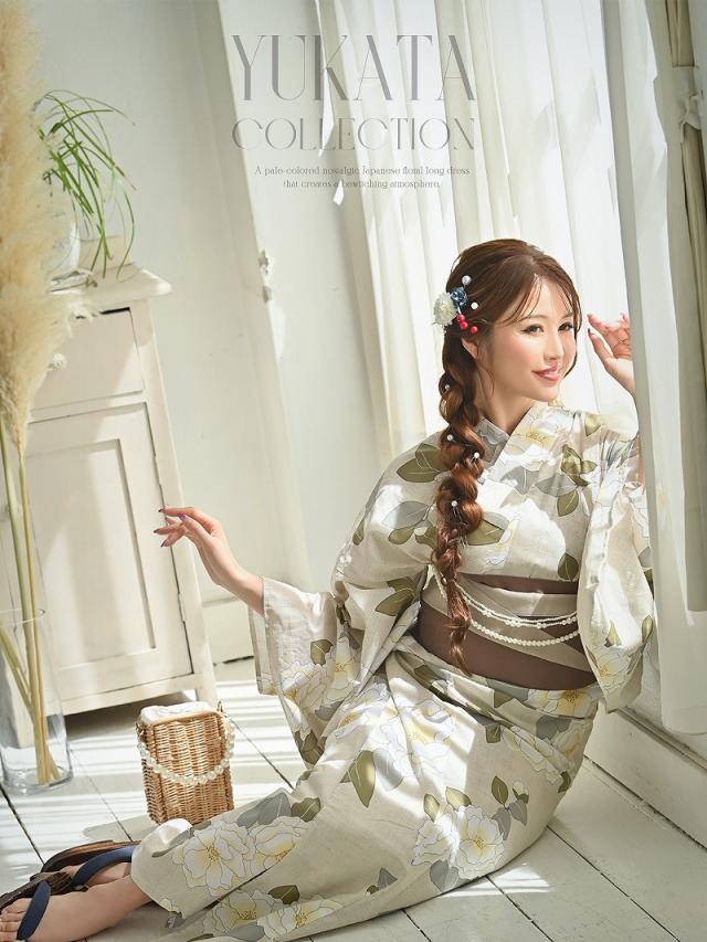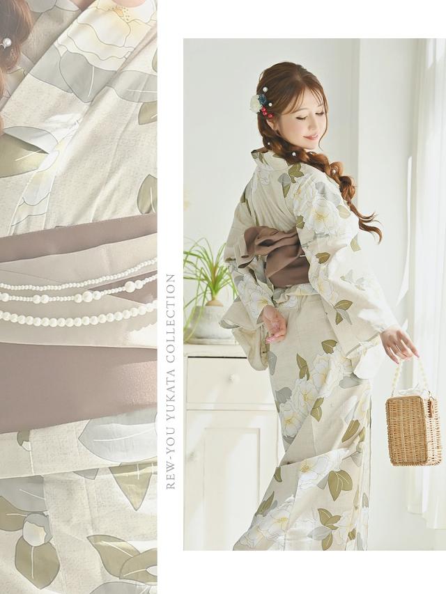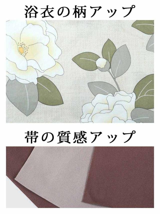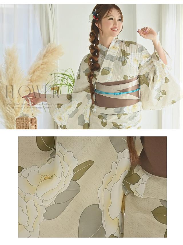 ☆ベージュ地に牡丹とリーフ柄が大人らしい上品さを引き立てるデザインの夏浴衣。