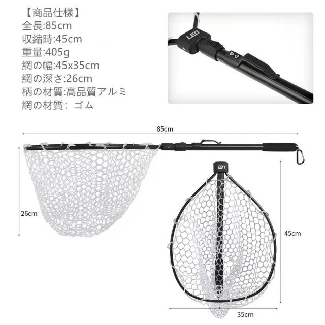【商品仕樣】全長:85cm、収縮時:45cm、重量:405g、網の幅:45x35cm、網の深さ:26cm、柄の材質:高品質アルミ、垂直方向に持ち上げる場合:<5kg、前後方向に沿って持ち上げる場合:<20kg。