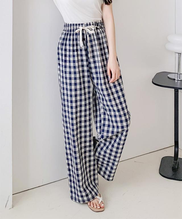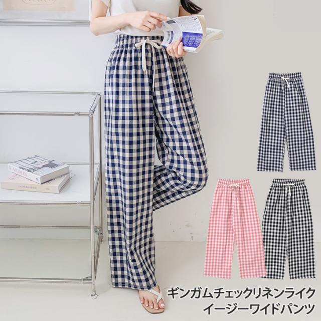 新作 ギンガムチェックリネンライクドロストイージーワイドパンツ レディース ボトムス 夏 薄手 涼しい 涼感 ロング丈 ウエストゴム ハイウエスト ゆったり 大きめ 楽ちん おしゃれ 可愛い 韓国ファッション 高身長
