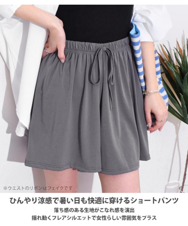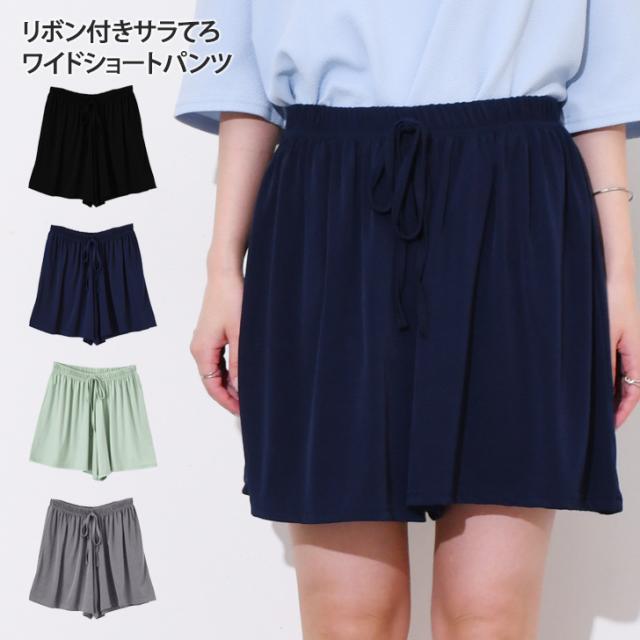 新作 リボン付きサラてろワイドショートパンツ レディース 涼しい 夏 ひんやり 涼感 速乾 スポーツ ハーフパンツ 暑さ対策 楽ちん 薄手 膝上 ウエストゴム 軽量 ズボン 部屋着 ルームウェア 旅行 ゆったり