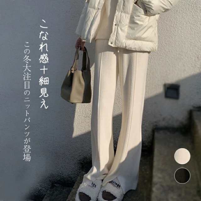 ワイドパンツ ニット レディース ボトムス パンツ ロング ニットパンツ リブパンツ スリット きれいめ 長ズボン ストレートパンツ リブニット リブ ワイド 美脚パンツ ロング丈 ハイウェスト シンプル 伸縮 秋冬 秋 冬 あたたか 通勤 通学 普段着 デート ママコーデ