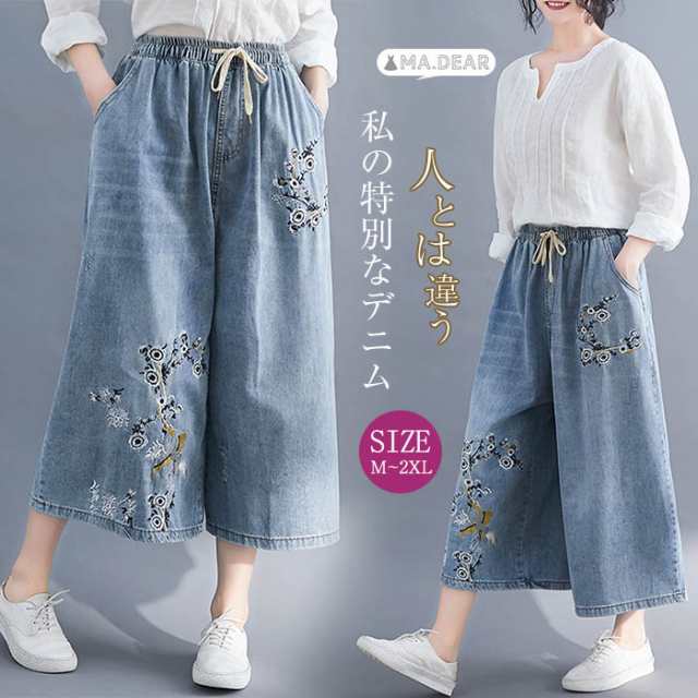 ワイドパンツ レディース ガウチョパンツ デニム 春 夏 デニムパンツ 花柄 刺繍 大きいサイズ ゆったり ボトムス キュロット パンツ フレアパンツ 体型カバー ウエストゴム 紐付き ナチュラル リラックス 着痩せ 美脚 通勤 カジュアル 30代 40代 50代 送料無料