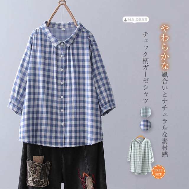 ガーゼシャツ 綿100% シャツブラウス レディース スタンドカラー シャツ ブラウス 半袖 トップス 五分袖 カジュアル ギンガムチェック チェック バックギャザー 大きいサイズ 体型カバー ゆったり 通勤 夏 シンプル ガーゼコットン 柔らかい 20代 30代 40代 50代