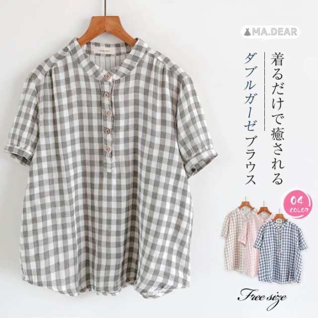 チェック柄 ガーゼ シャツ 半袖 シャツブラウス レディース 2重ガーゼ ブラウス トップス 夏 チェック プルオーバー ギンガムチェック カジュアル ナチュラル ダブルガーゼ 大きいサイズ 体型カバー 柔軟 通勤 シンプル 柔らかい ゆったり ガーゼコットン 30代 50代 40代