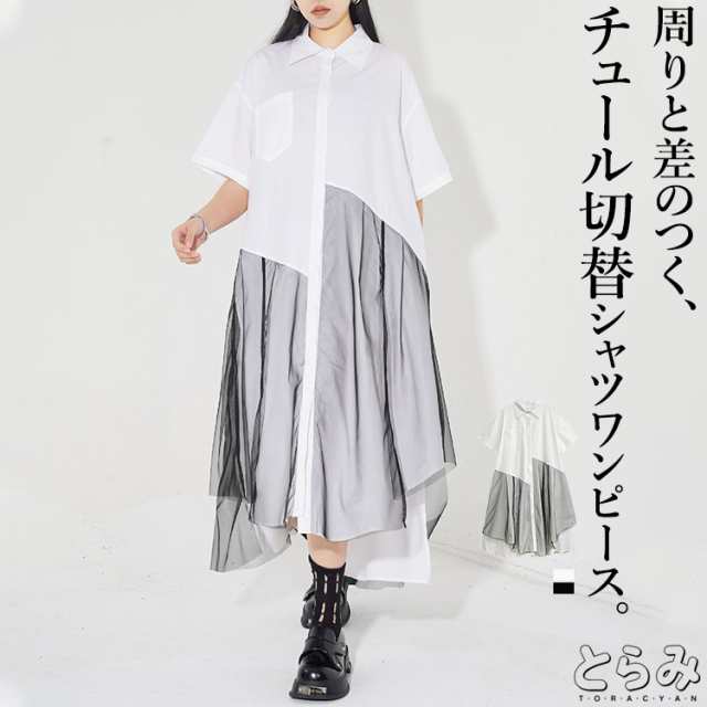 チュールドッキングワンピース シャツワンピース レディース ロングワンピース 半袖 異素材 羽織 個性的 モード系 アシンメトリー 変形デザイン ビッグシルエット 大きいサイズ メンズ ユニセックス 体型カバー 春 夏 とらみ 送料無料