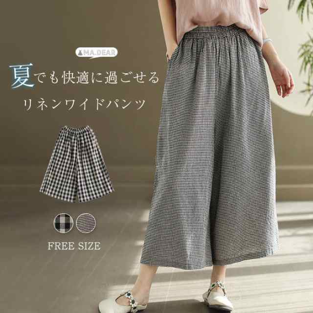 リネン ワイドパンツ レディース ゆったり チェック リネンパンツ ガチョウパンツ キュロットパンツ 大きいサイズ イージーパンツ ボトムス フレアパンツ ロング 綿麻混 コットンリネン 体型カバー きれいめ 上品 美脚 通勤 着痩せ カジュアル ナチュラル 40代 30代 50代