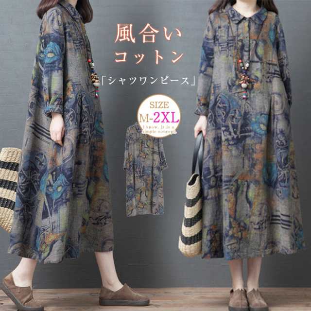 シャツワンピース 秋 レディース ロングワンピース 長袖 シャツワンピース ロング 綿 コットン ワンピース ミモレ丈 森ガール レトロ 大きいサイズ ゆったり 体型カバー ロングワンピ Aライン 着?せ カジュアル 大人可愛い 春 秋 冬 きれいめ 送料無料