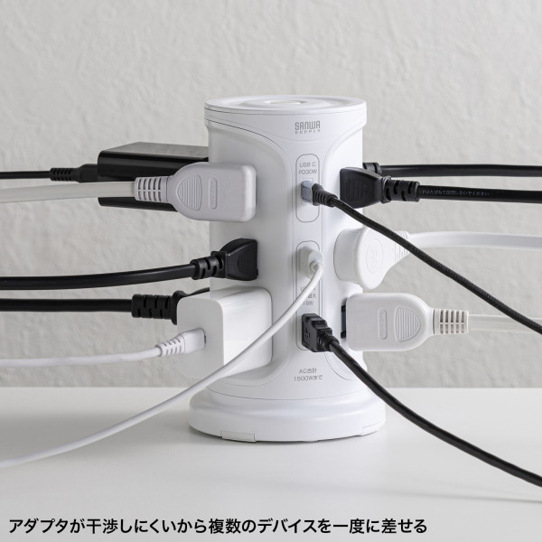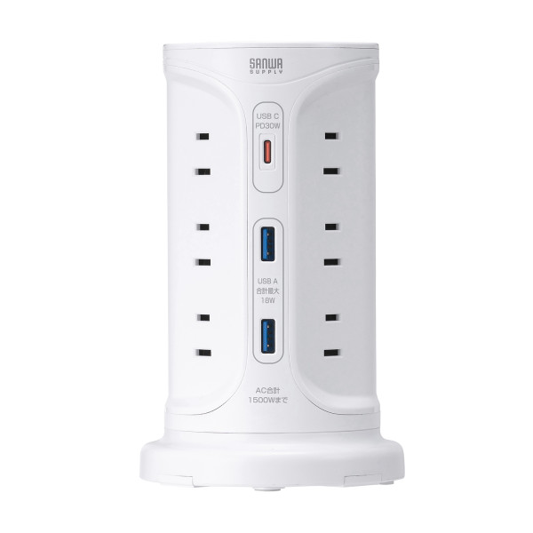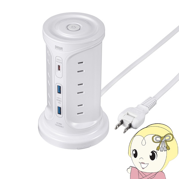 サンワサプライ 電源タップ タワー型電源タップ タワータップ USB充電対応 PD30W タイプC搭載 12個口 2m ホワイト TAP-B112C1A2W