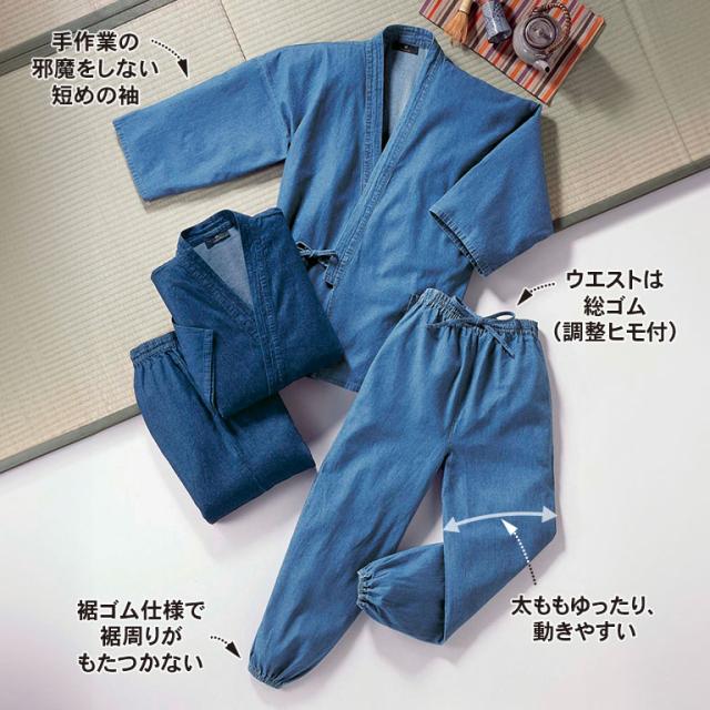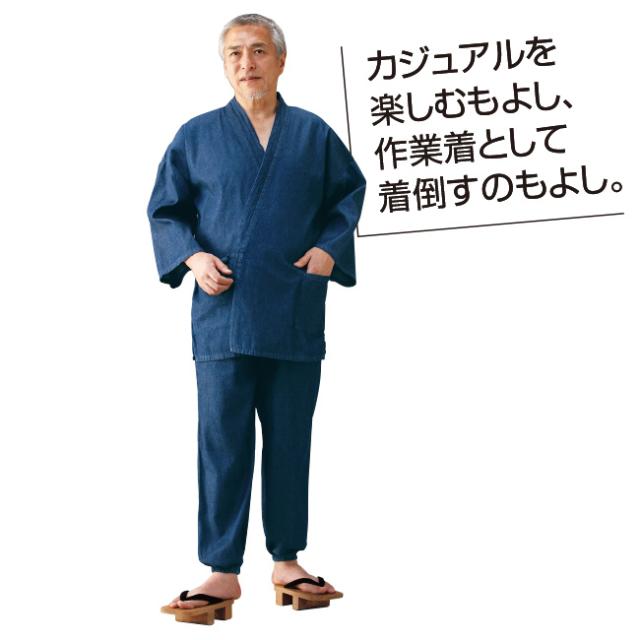 やわらかデニム作務衣 - メンズ レディース デニム 作務衣 さむえ カジュアル オールシーズン ウエストゴム 和服 和装 カジュアル 作業着 部屋着 おしゃれ ラク S M L LL 3L インディゴブルー 淡いブルー 男女兼用 121519