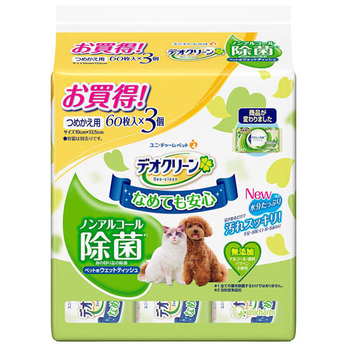 ペットがなめても安心ノンアルコール除菌ペット用ウェットティッシュの詰め替え用お得な3パック入り。