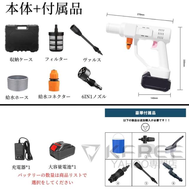 ★お届け内容:洗車高圧ガン本体x1、収納ケースx1、角度切替可の6in1多機能マルチノズルx1、バブルボトル用ノズル*1、大容量バッテリー(別購入)、フィルタx1、給水ホースx1、ホースリテーナx1、充電アダプターx1(別購入)。