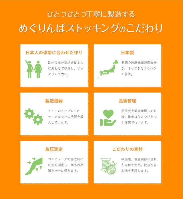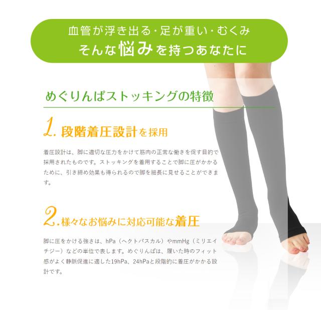 めぐりんぱ弾性ストッキングは、段階的な圧力を加えることにより、脚の静脈瘤、リンパ液のうっ滞を軽減または予防し、静脈還流を即新します。
