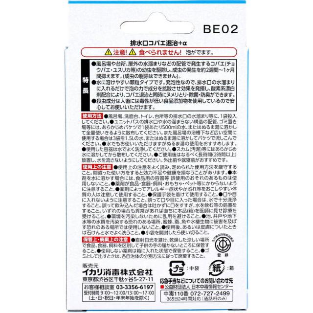 ●風呂場や台所、屋外の水溜まりなどの配管で発生するコバエ(チョウバエ・ユスリカ等)の幼虫を駆除し、成虫の発生を約2週間〜1ヶ月間抑えます。(成虫の駆除はできません)。