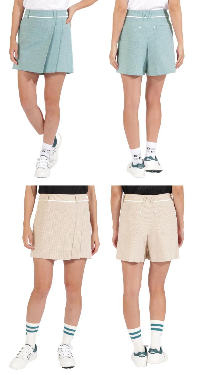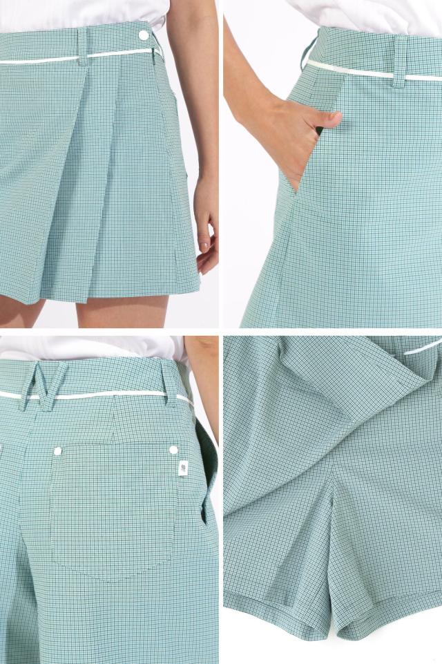 可愛いと動きやすさを両立したラップキュロット。サラリとした肌触りで柔らかさがあり4WAYストレッチを備えた着心地抜群のアイテム。スカート見えながら、パンツスタイルでアクティブな動きも安心して行うことが出来ます。ボタン付きファスナー式で着脱も楽々。細かいチェック模様は派手になりすぎない上品な雰囲気で着用いただけます。夏らしい爽やかなカラーリングで仕上げた3色からお選びください。総丈40cm