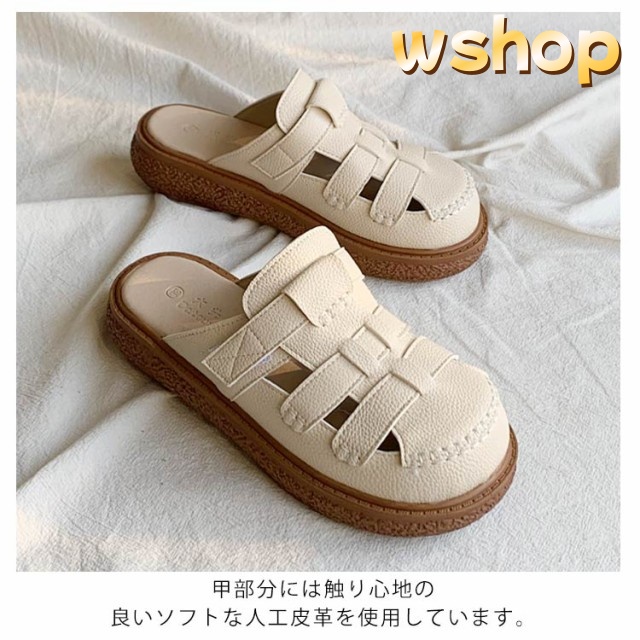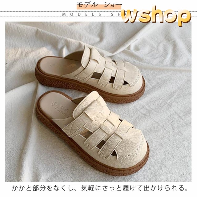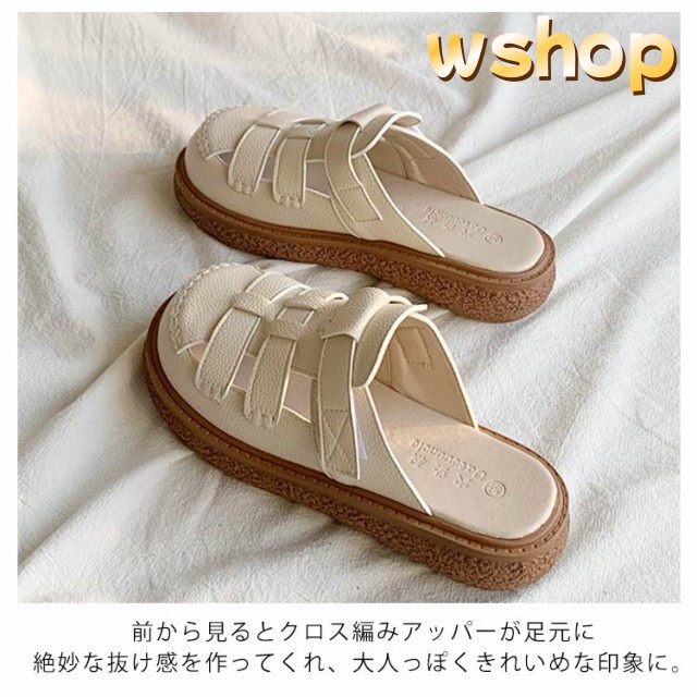 【wshop 】編み込み ミュール メッシュ サンダル サボ レディース 厚底 編み込み スリッポン フラットサンダル ぺたんこ クッションソール PUレザー クロス編み 透かし編み ローファー サボサンダル 靴 くつ 履きやすい 歩きやすい スリッパ リラックス ベージュ 幅広い
