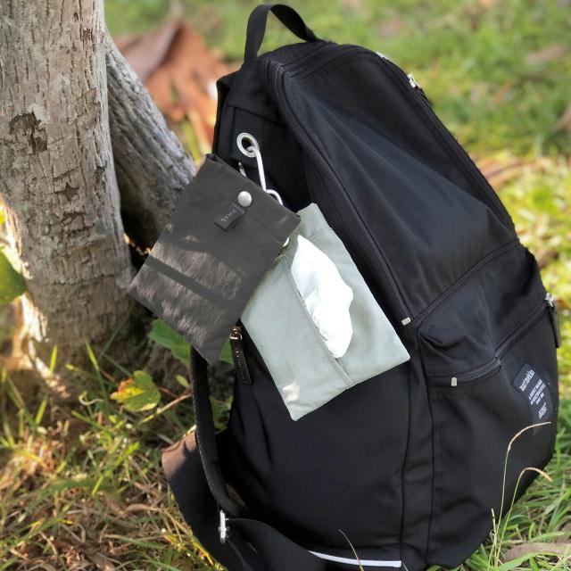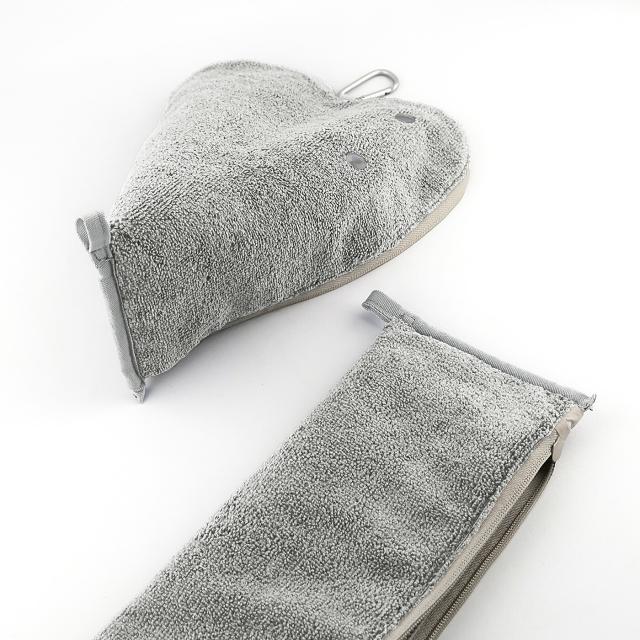 濡れた傘をさっと吸水し、カラビナでバッグの持ち手などに外付けできる折りたたみ傘ポーチです。