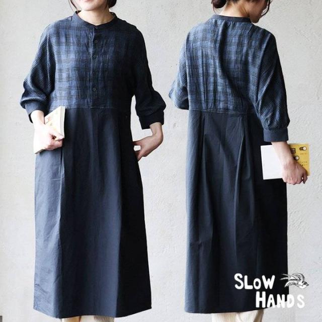 SLOW HANDS スローハンズ ワンピース 7分袖 レディース バンドカラー チェック柄 無地 切り替え 綿 麻 通気性 涼しい ゆったり 大きいサイズ 体型カバー カジュアル パティ