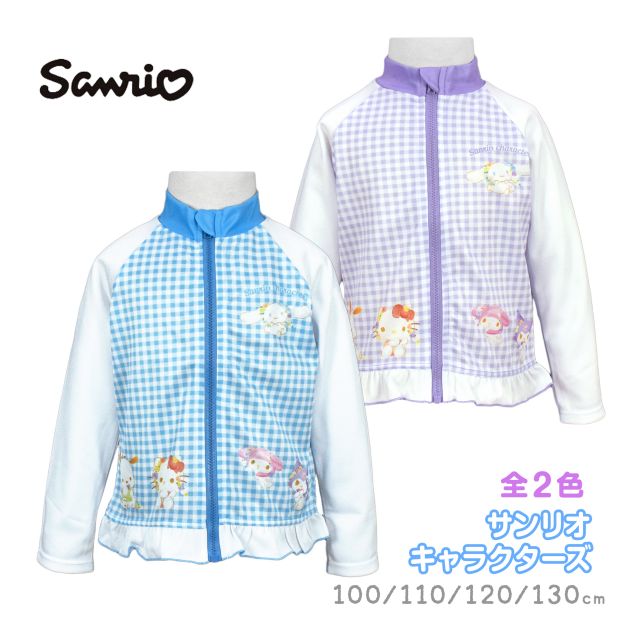 水辺のレジャーに限らず 普段使いのシーンでも着用できます。ギンガムチェック地の前身頃に シナモロール マイメロディ ポチャッコ クロミちゃん ハローキティ 後ろには タキシードサム リトルツインスターズ コギミュン ウィッシュミーメル ハンギョドン ポムポムプリン のかわいいプリント入り ラッシュガード 。ファスナーガード付き。