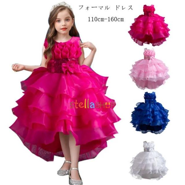 ピアノ発表会 花柄 ドレス 前後丈 プリンセス フォーマル ドレス 女の子 結婚式 ドレス ウェディングドレス 子供用 ドレス カワイイ スウィート ドレス バラ ピンク ブルー ホワイト ノースリーブ ドレス 入学式 卒業式 受験用 七五三 110 120 130 140 150 160