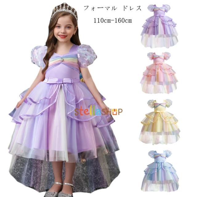 ピアノ発表会 虹色 ドレス 前後丈 プリンセス フォーマル ドレス 女の子 結婚式 ドレス ウェディングドレス 子供用 ドレス カワイイ スウィート ドレス パープル ピンク イエロー ブルー 半袖 ドレス 虹色 入学式 卒業式 受験用 七五三 110 120 130 140 150 160